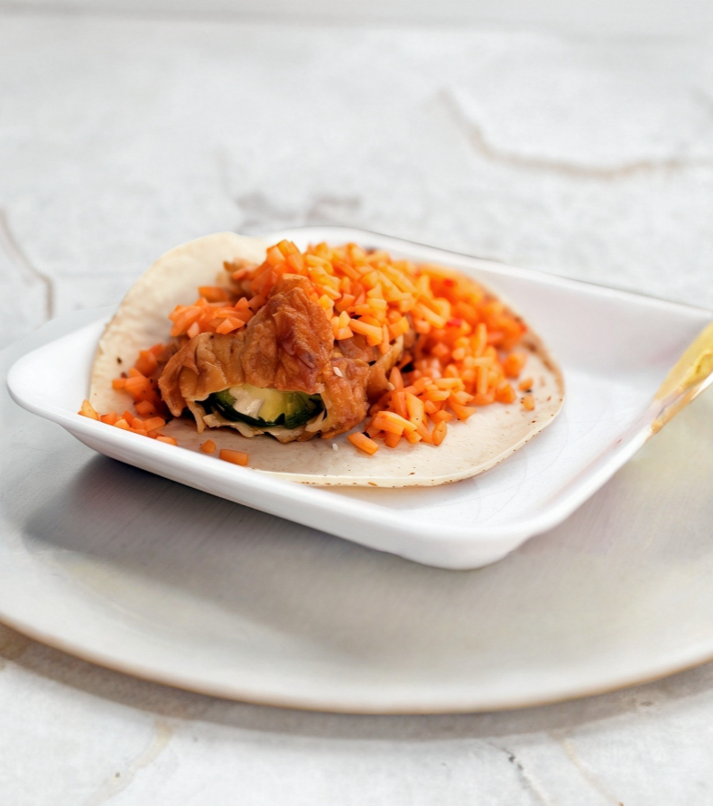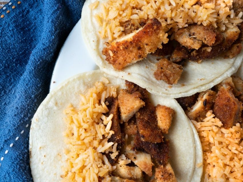 (Personal) Taco Milanesa (75 gramos) de harina de maiz Incluye arroz y frijol(110 gramos ), acompañados de salsa verde con aguacate.