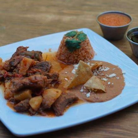 Platillo de tu guiso favorito que incluye arroz, frijoles y tortilla.