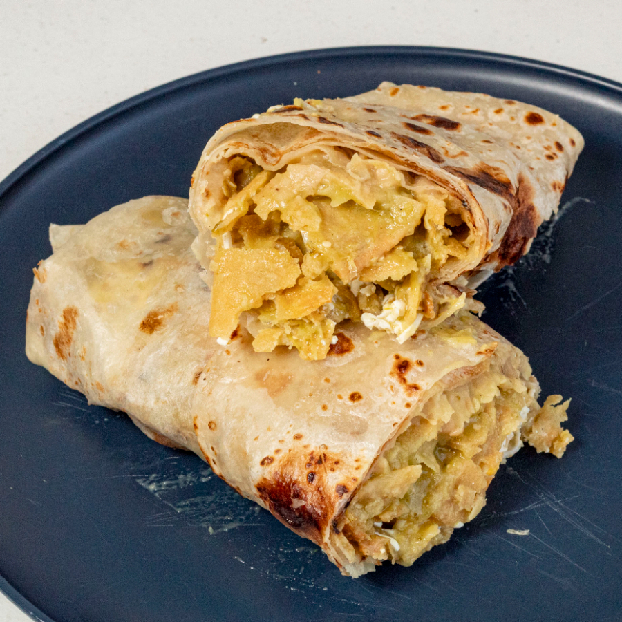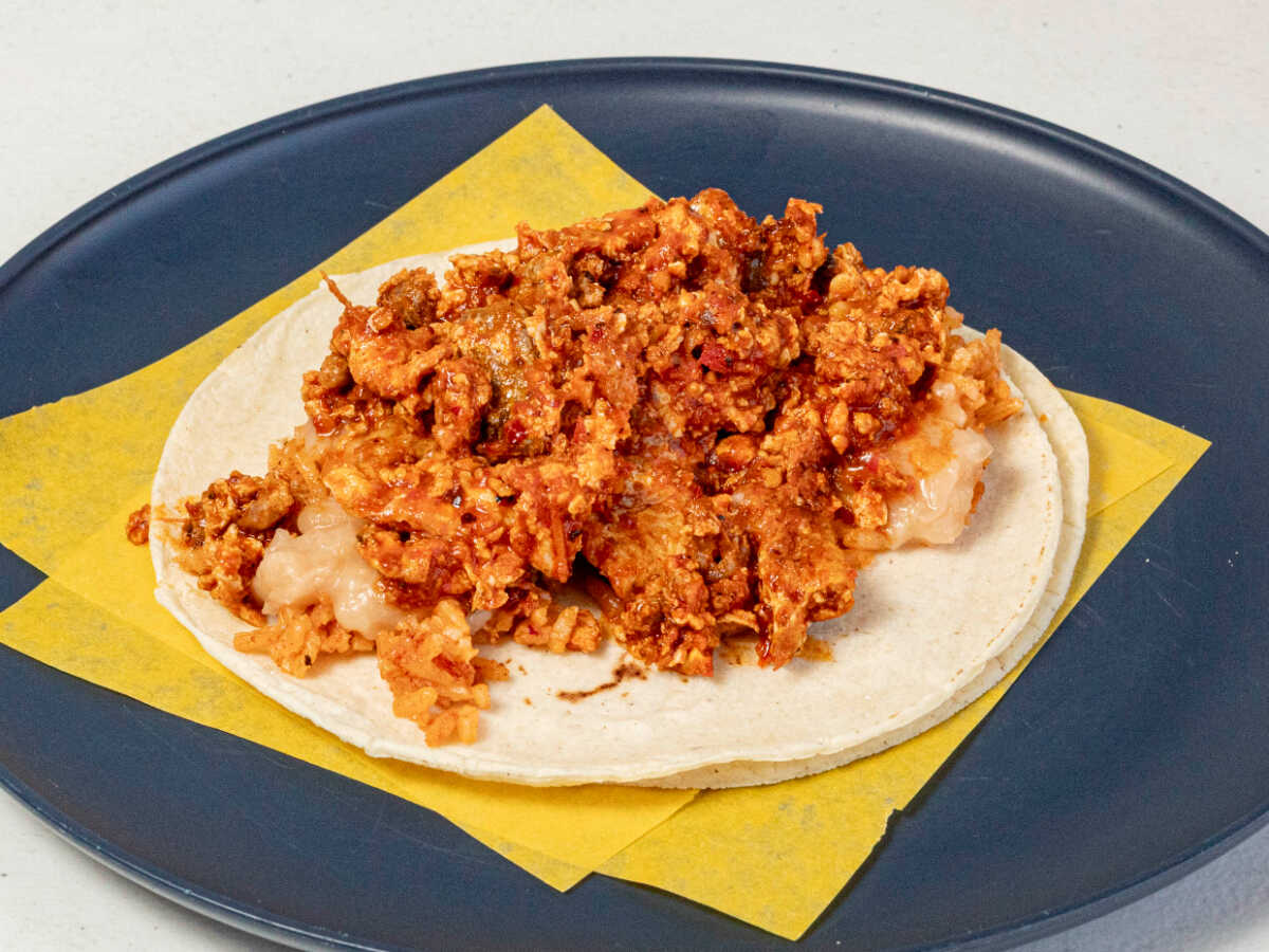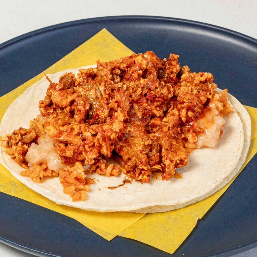Taco con tortilla a elegir, base de arroz blanco, frijol y machaca de res con huevo.
