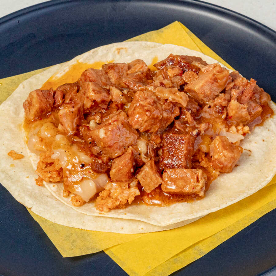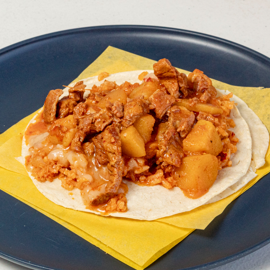 Taco con tortilla a elegir, base de arroz blanco, frijol y costillas de puerco en salsa a elegir.