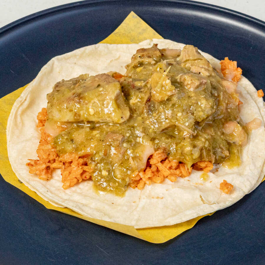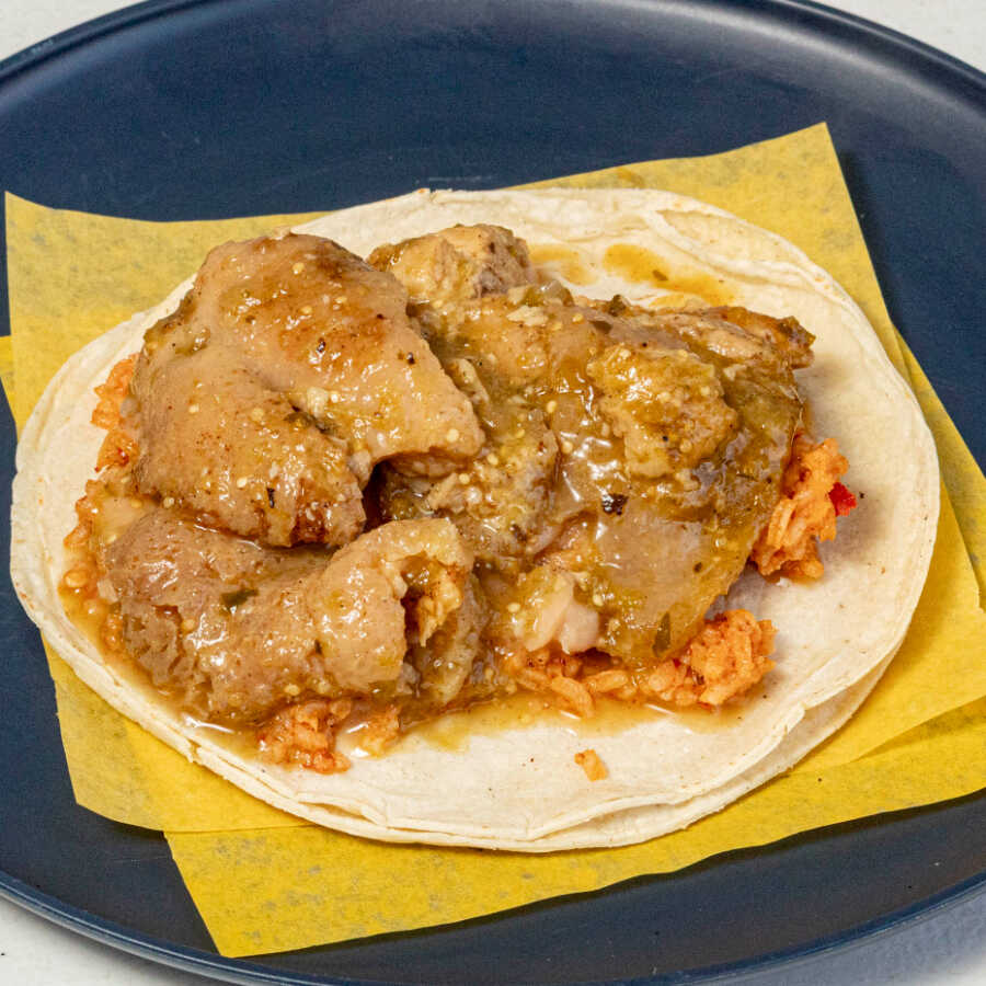 Taco con tortilla a elegir, base de arroz blanco, frijol y chicharrón en salsa a elegir.