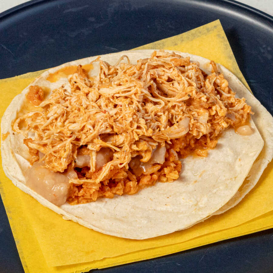 Taco con tortilla a elegir, base de arroz blanco, frijol y pollo en crema chipotle.
