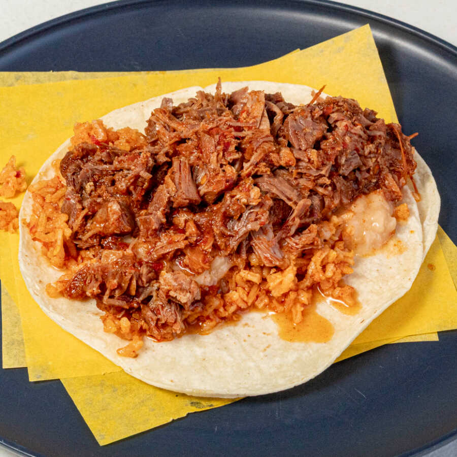 Taco con tortilla a elegir, base de arroz rojo, frijol y barbacoa de res estilo guerrero.