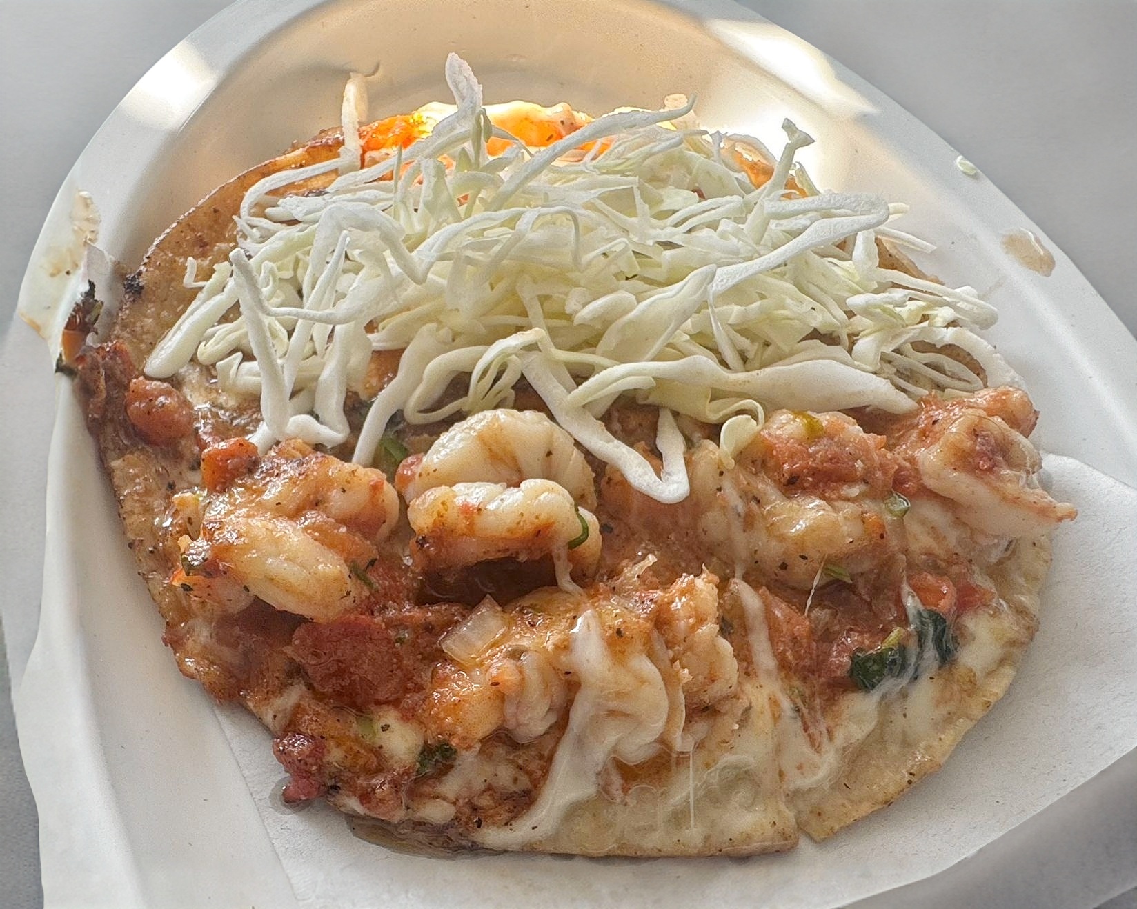 Tortilla de maíz con camarón cocido acompañado de queso Monterrey Jack con la salsa de la casa, salsa mexicana, repollo, crema y aderezo.