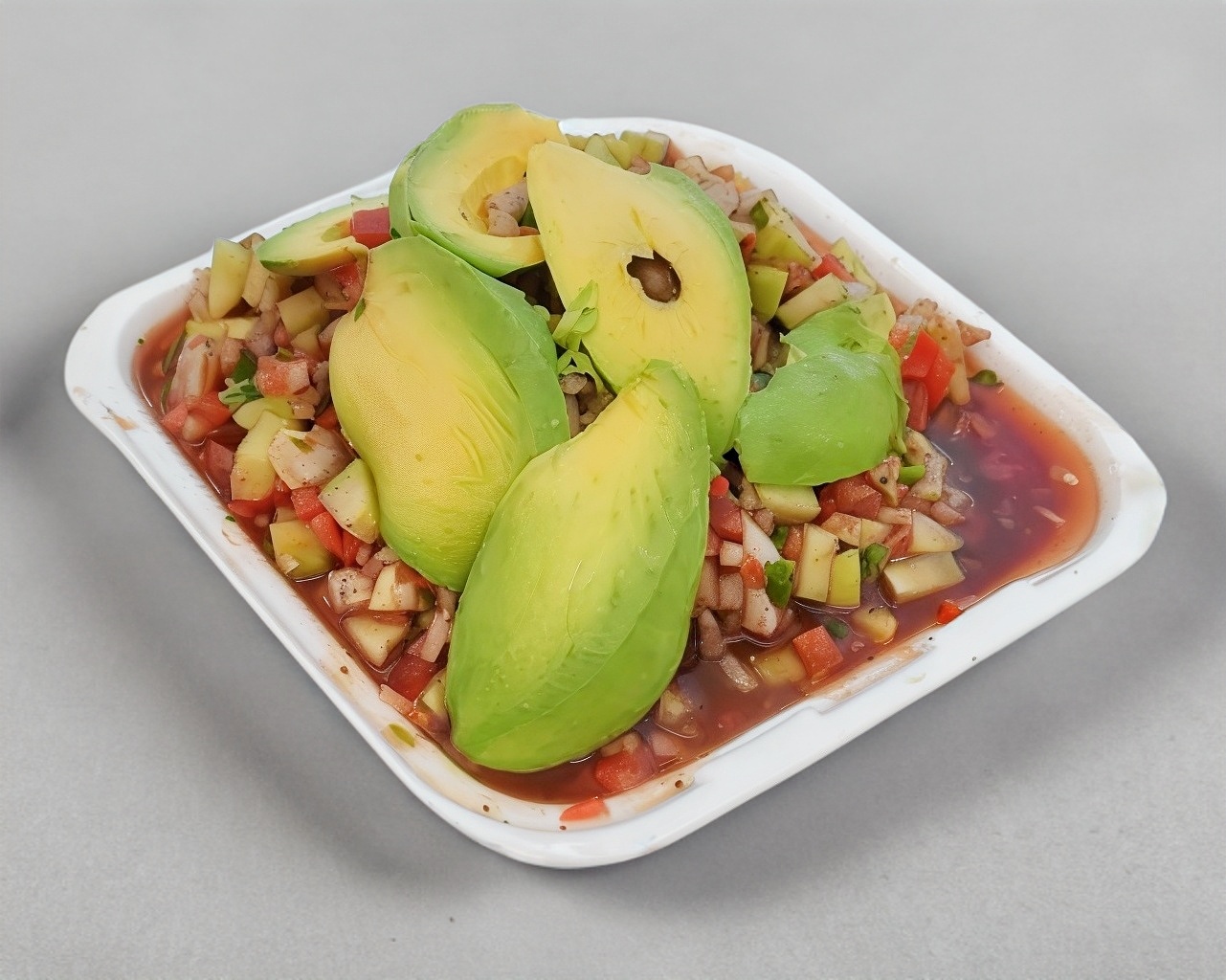 Camarón cocido fresco con cebolla morada, tomate, pepino, aguacate, acompañado con salsas y sabor de la casa.