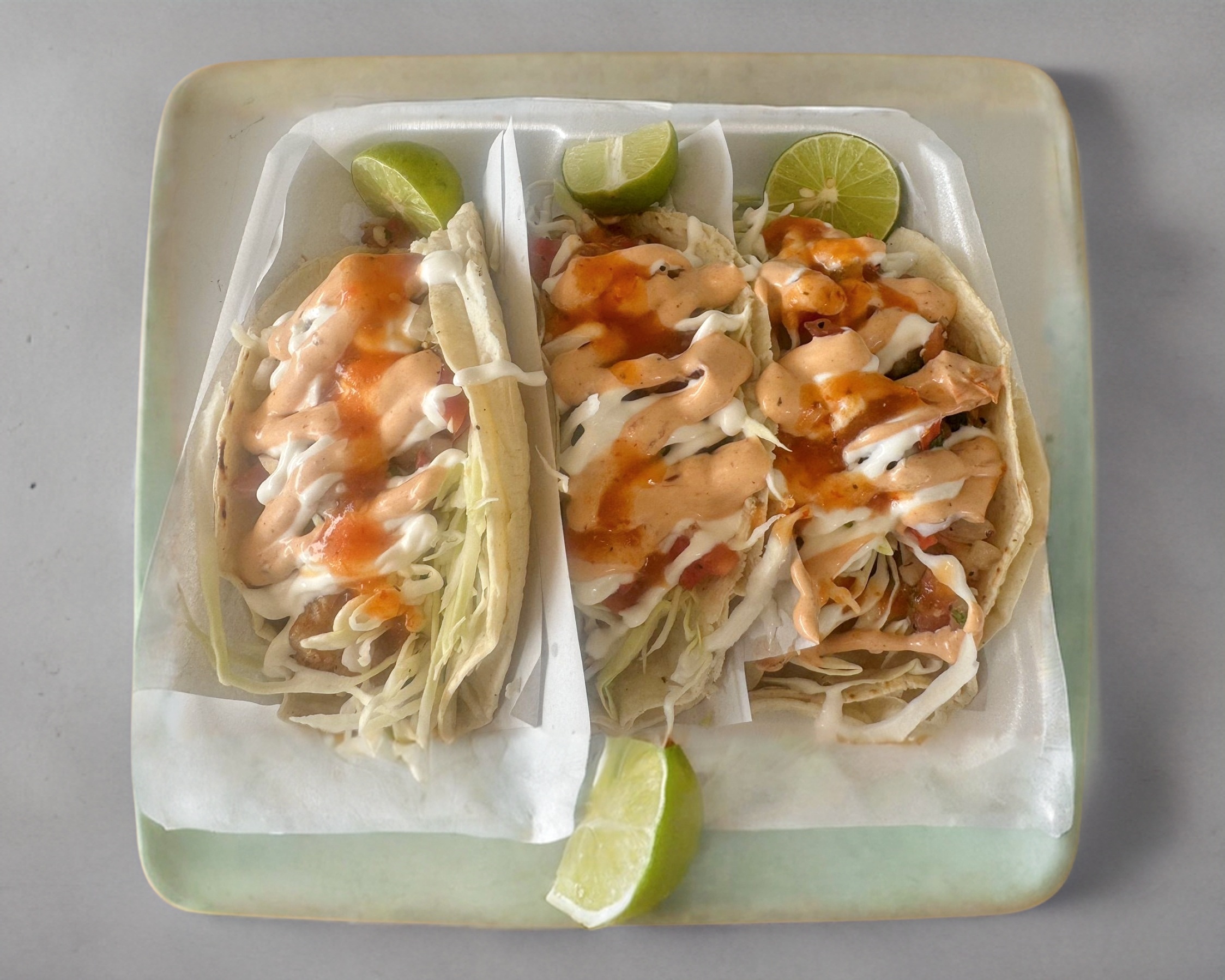 3 Deliciosos tacos de pescado capeado con salsa mexicana, repollo, crema y aderezo. Incluye bebida al gusto.