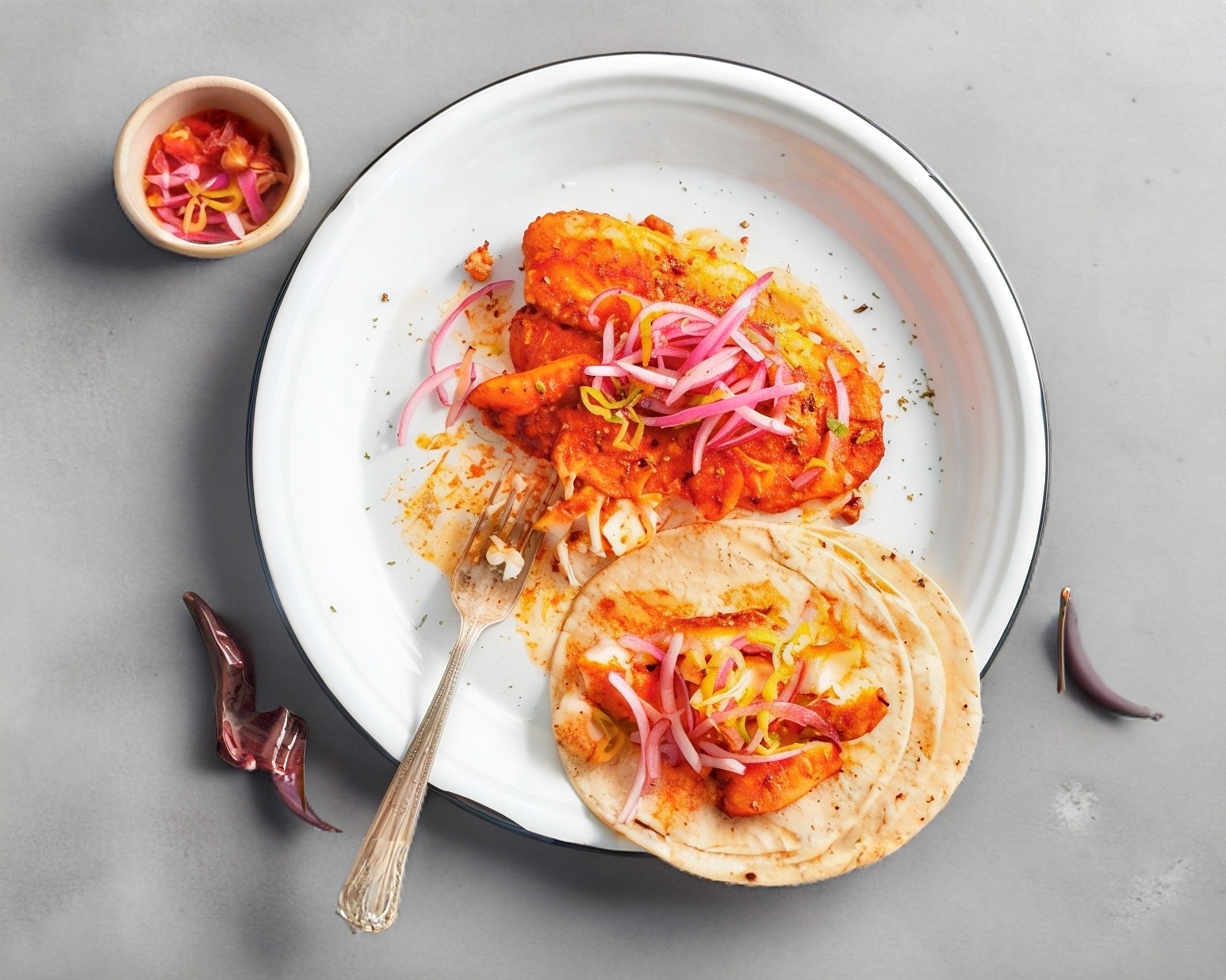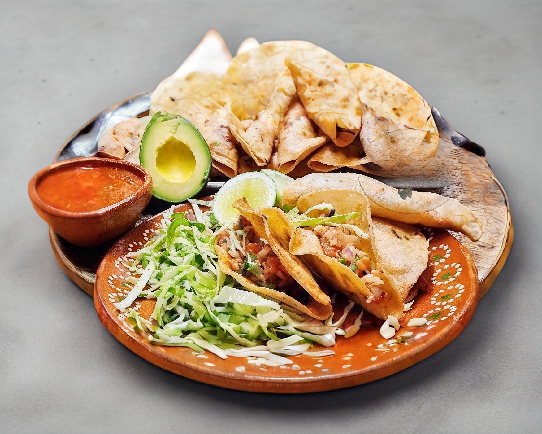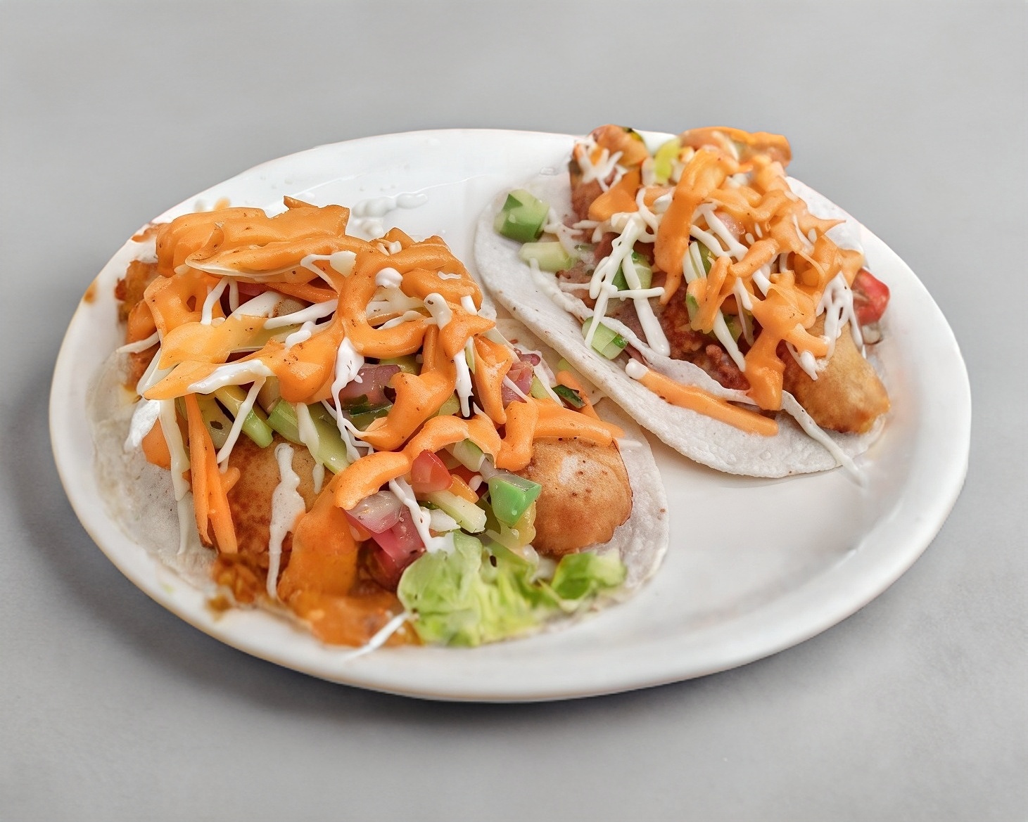 Platillo personal. Deliciosos pescados capeados con salsa mexicana, repollo, crema y aderezo.