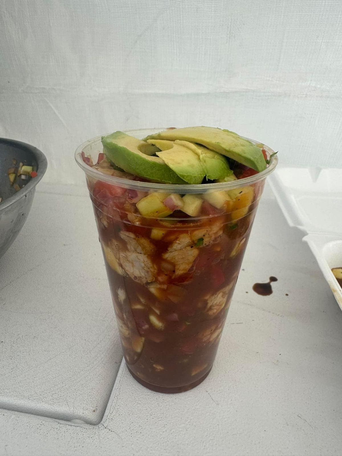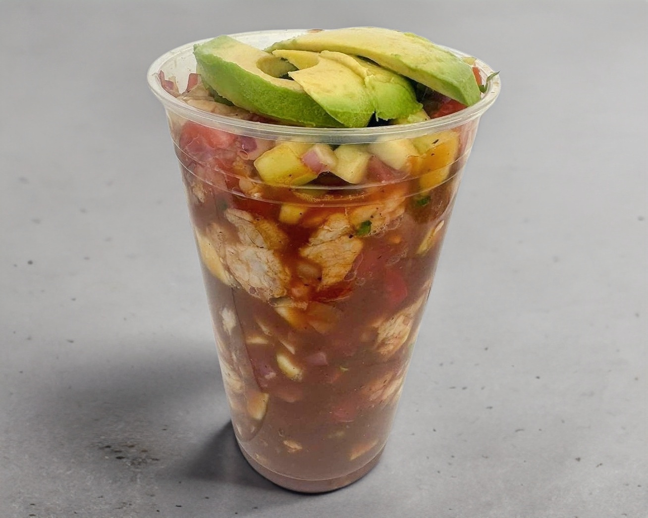 Camarón fresco curtido combinado con cebolla morada, tomate, pepino, aguacate y chile chiltepín.