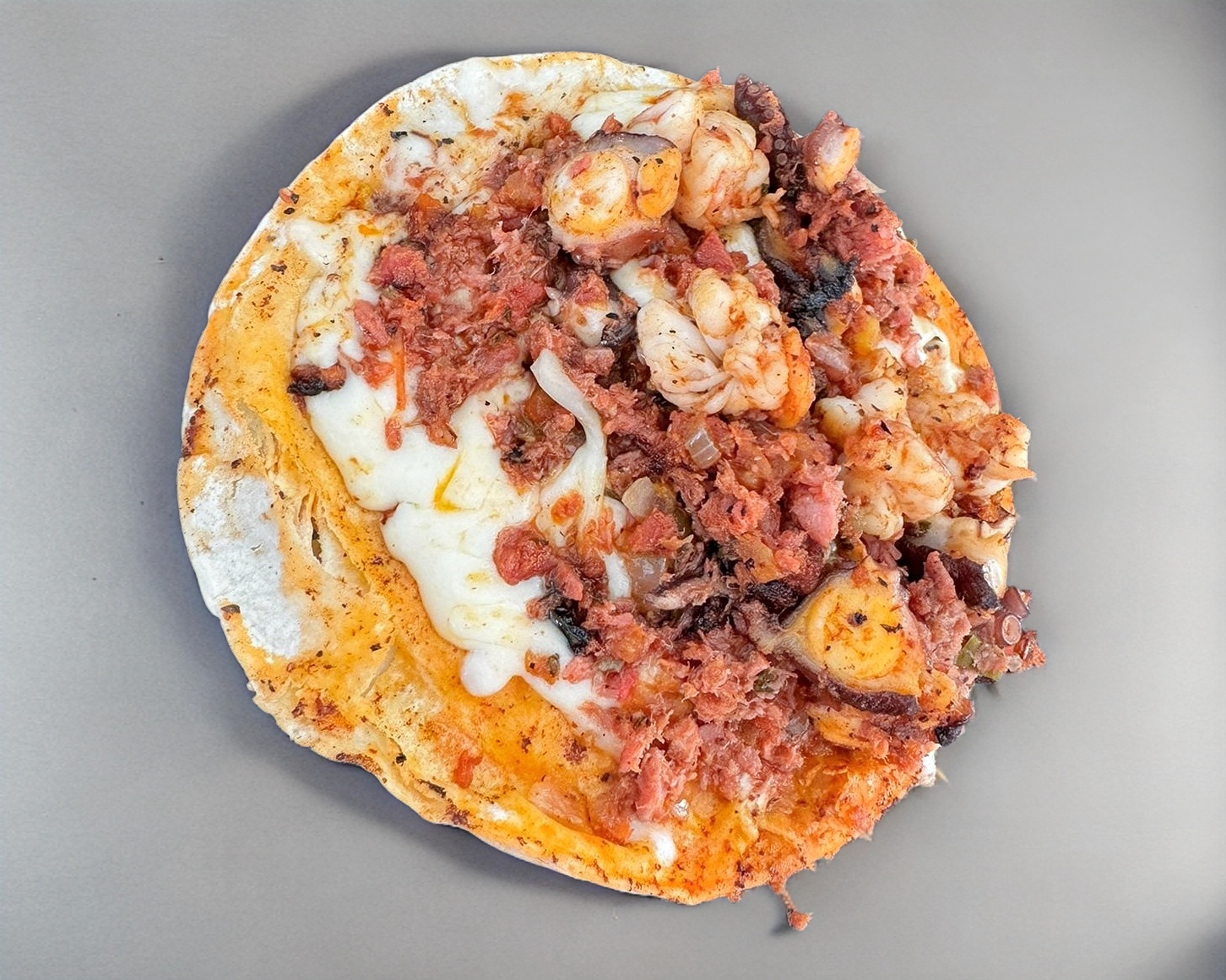 Tortilla de maíz con camarón y pulpo acompañado con la salsa de la casa, queso Monterrey Jack, salsa mexicana, repollo, crema y aderezo.