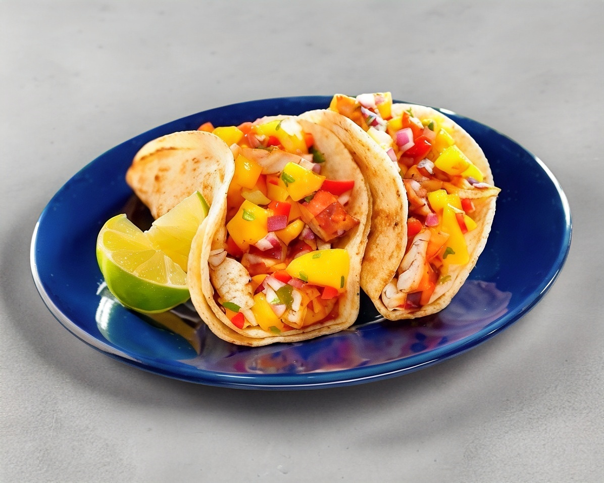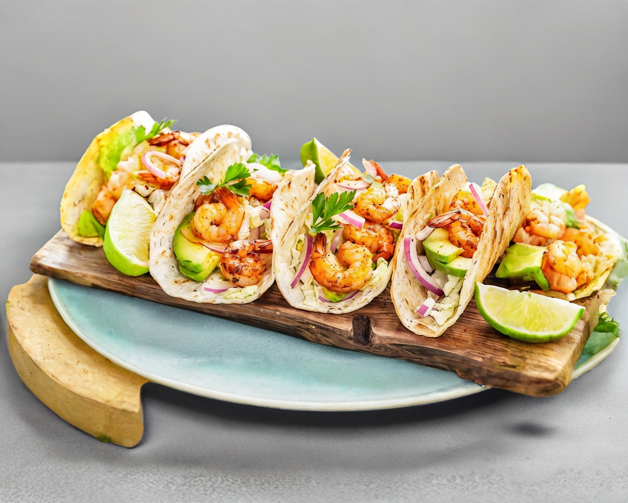 Tortilla de maíz con guisado de camarón a la mexicana, acompañado de queso Monterrey Jack, salsa mexicana, repollo, crema y aderezo.