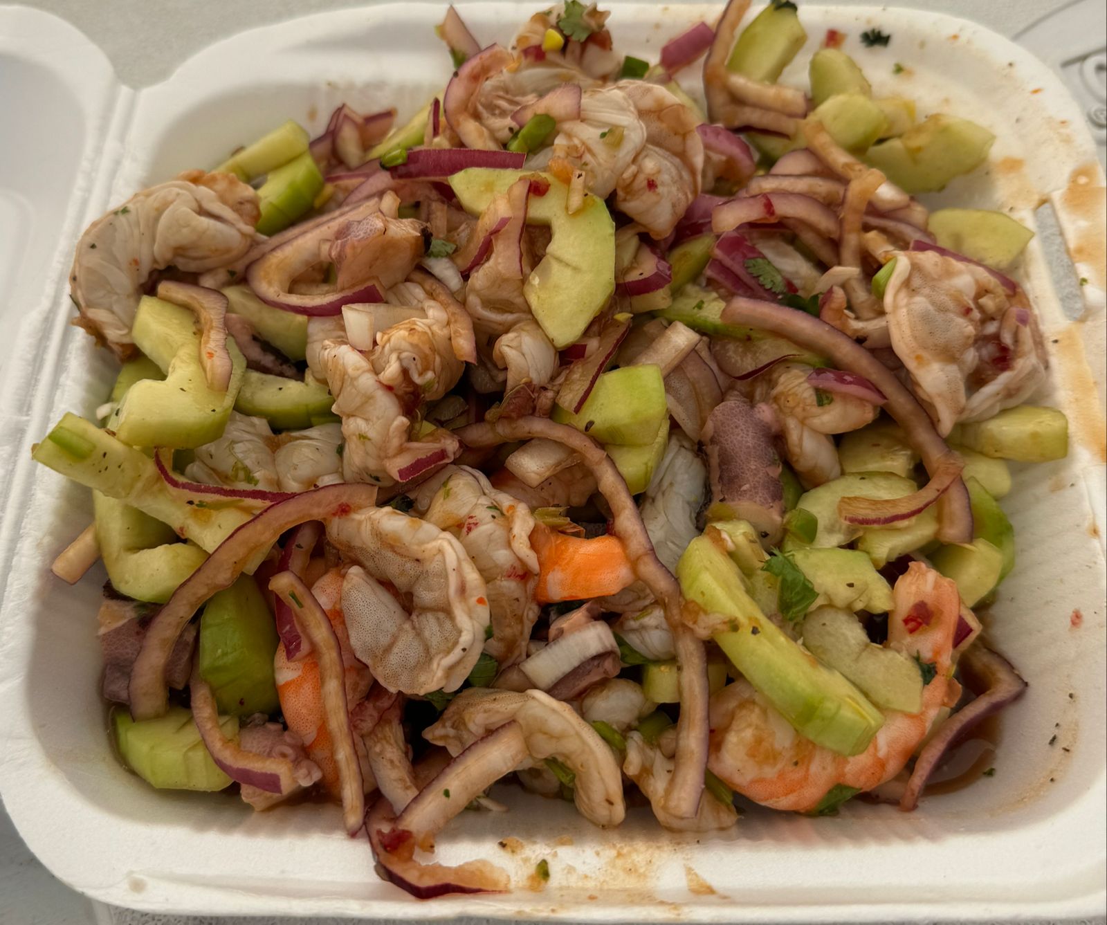 Camarón crudo, camarón y pulpo cocido combinado con cebolla morada, pepino, aguacate, acompañado con salsas y el sabor de la casa.