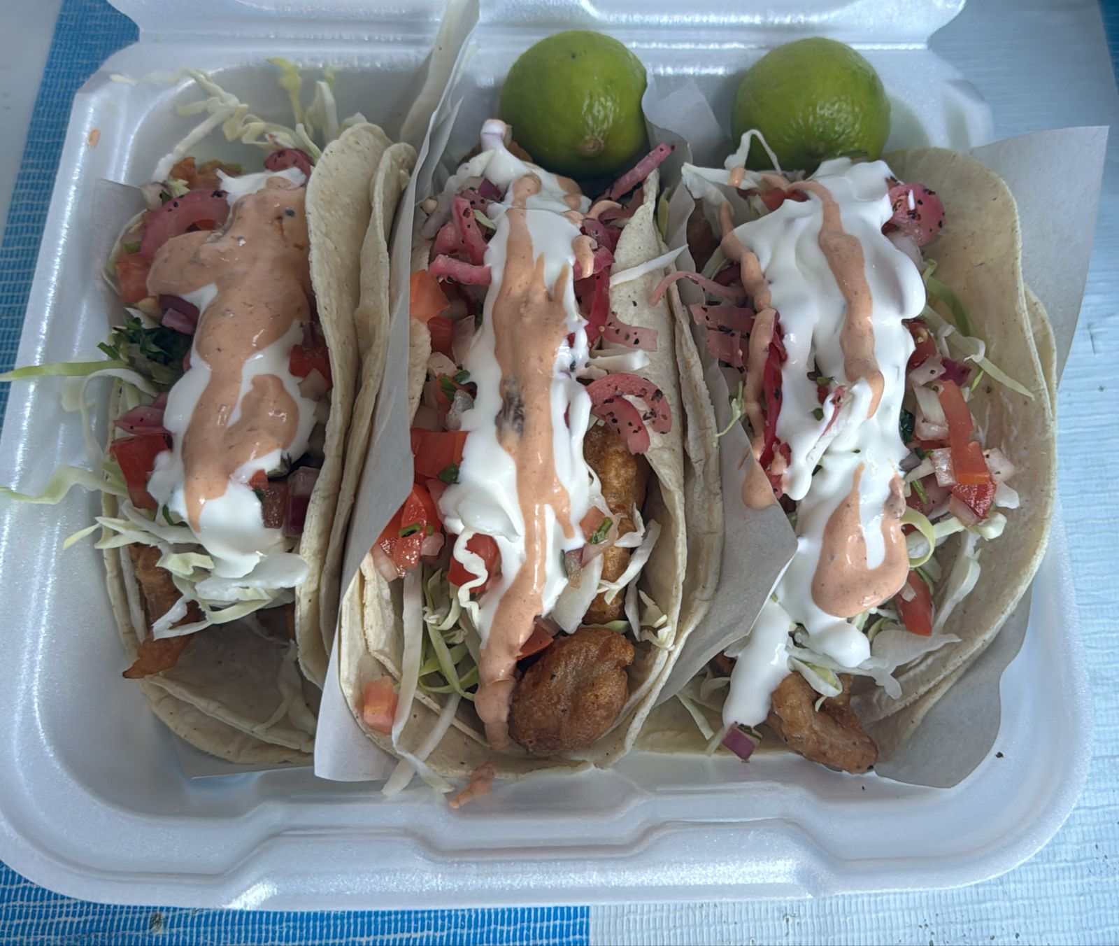 3 Deliciosos tacos de camarón capeado con salsa mexicana, repollo, crema y aderezo. Incluye bebida al gusto.