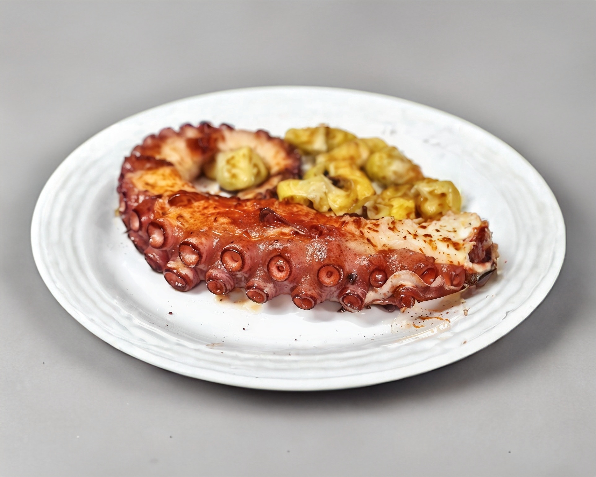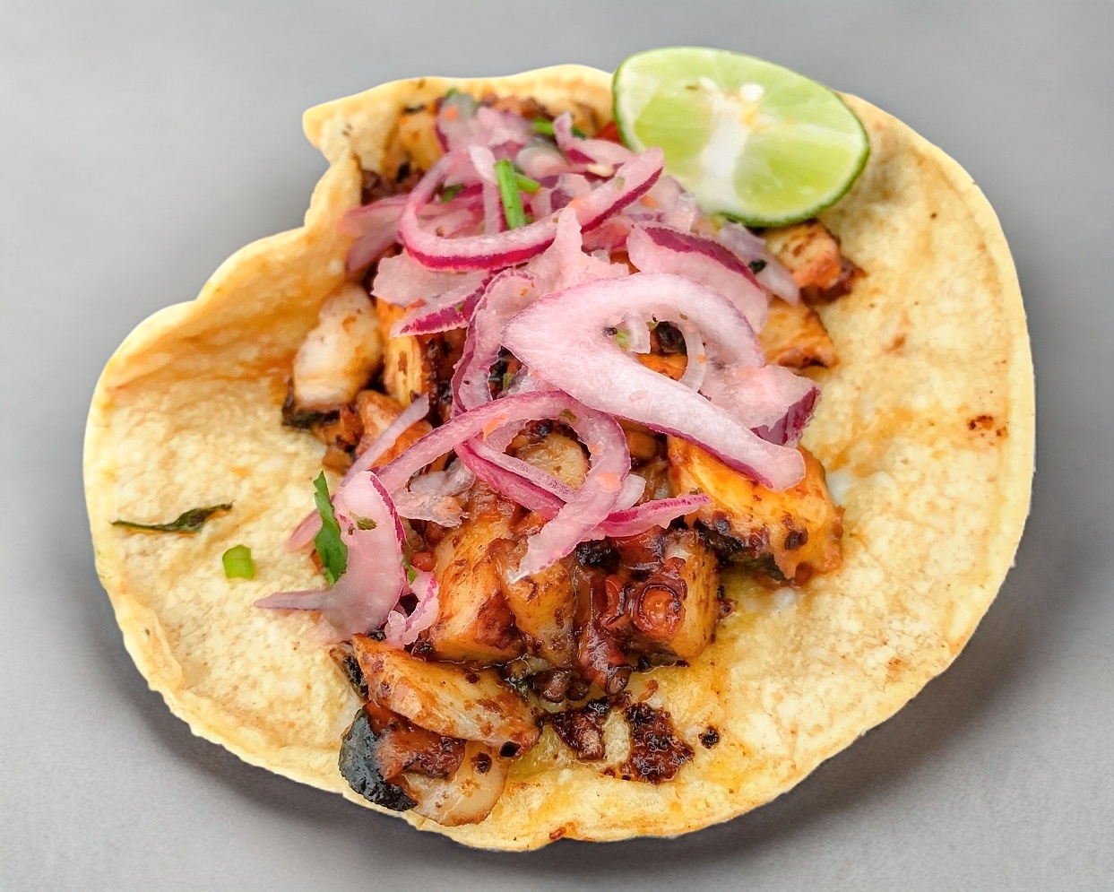 Tortilla de maíz con pulpo a la plancha acompañado de queso Monterrey Jack con salsa mexicana, repollo, crema y aderezo.