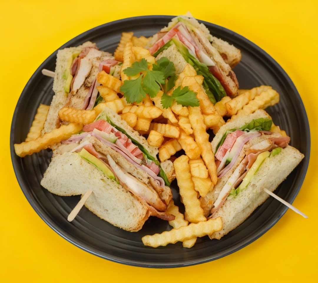 Mayonesa, Lechuga, jamón, pepino, tomate, pollo,queso, tocino. Acompañado de papas a la francesa