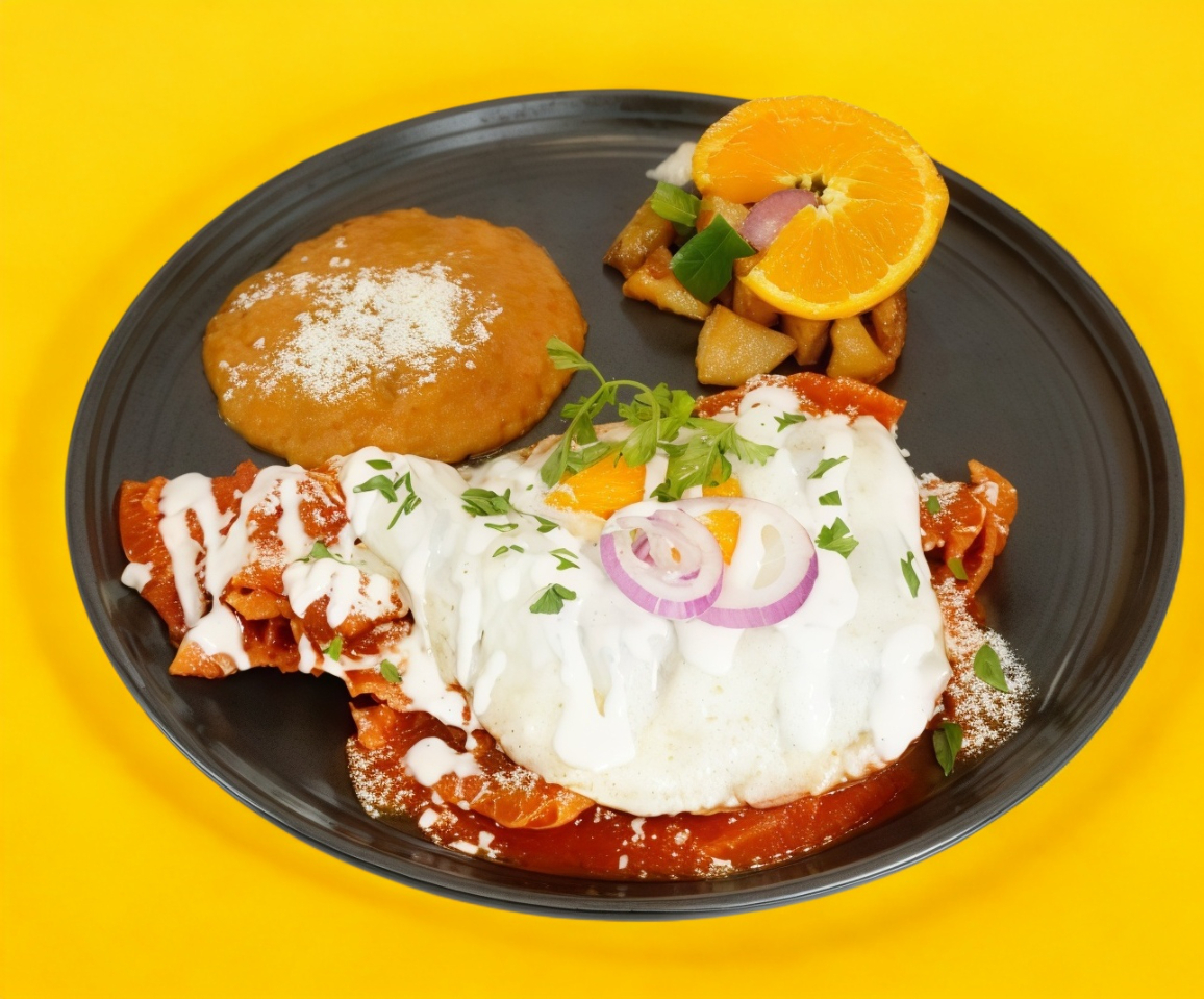 3 Pzs. de tortillas bañada en salsa roja, acompañadas con frijol.