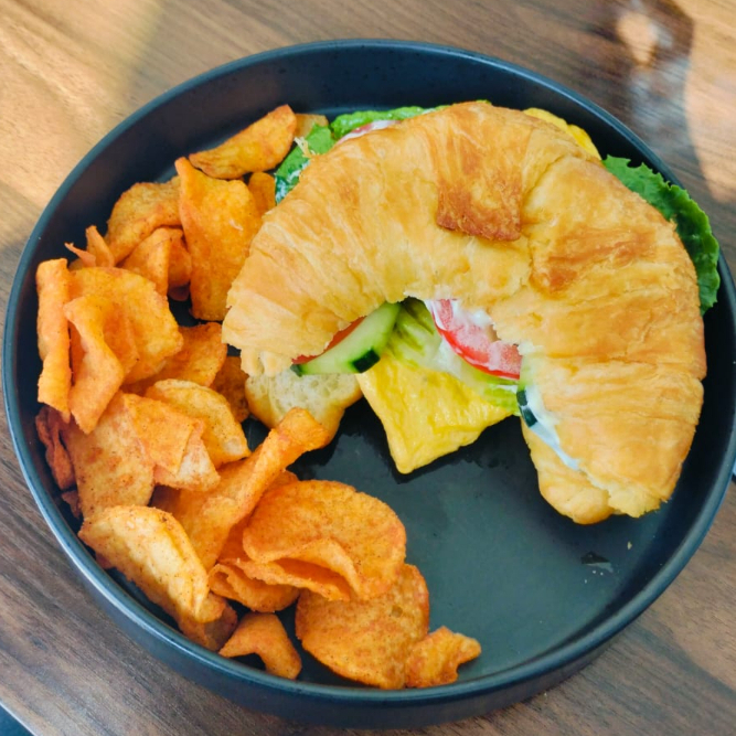 Huevo revuelto en un croissant con jamón y queso, acompañado de papas estilo Sabritas.