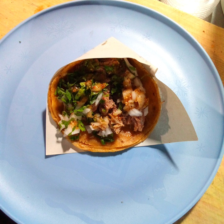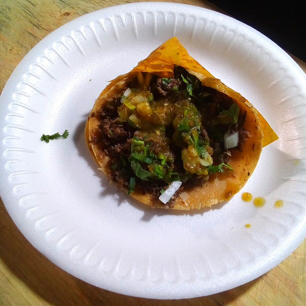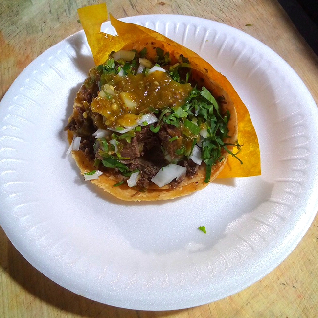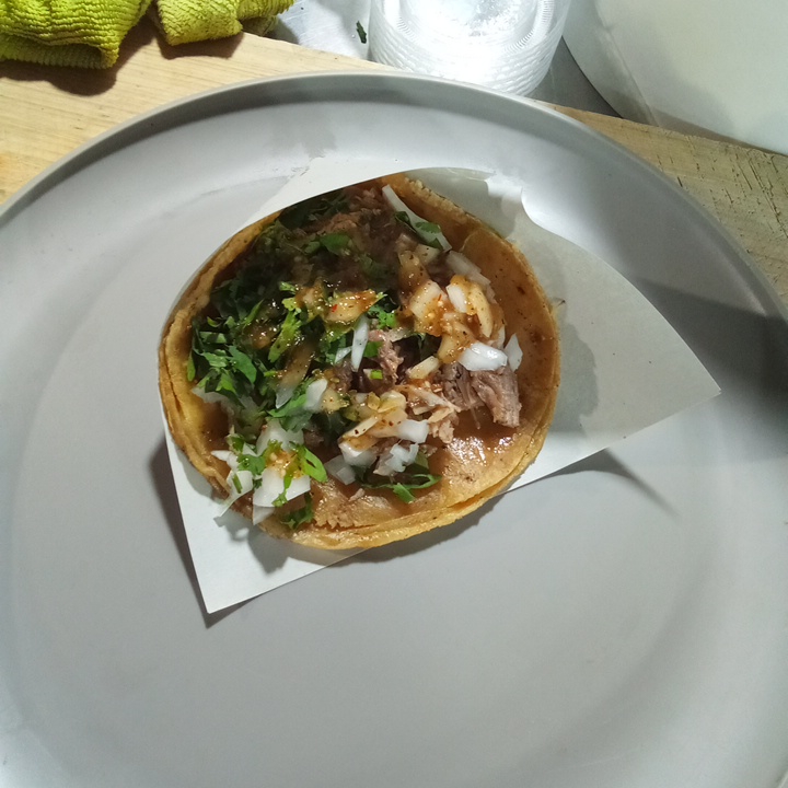 Taco con tortilla de maíz, cabeza, cilantro, cebolla y salsa, 1 pz.