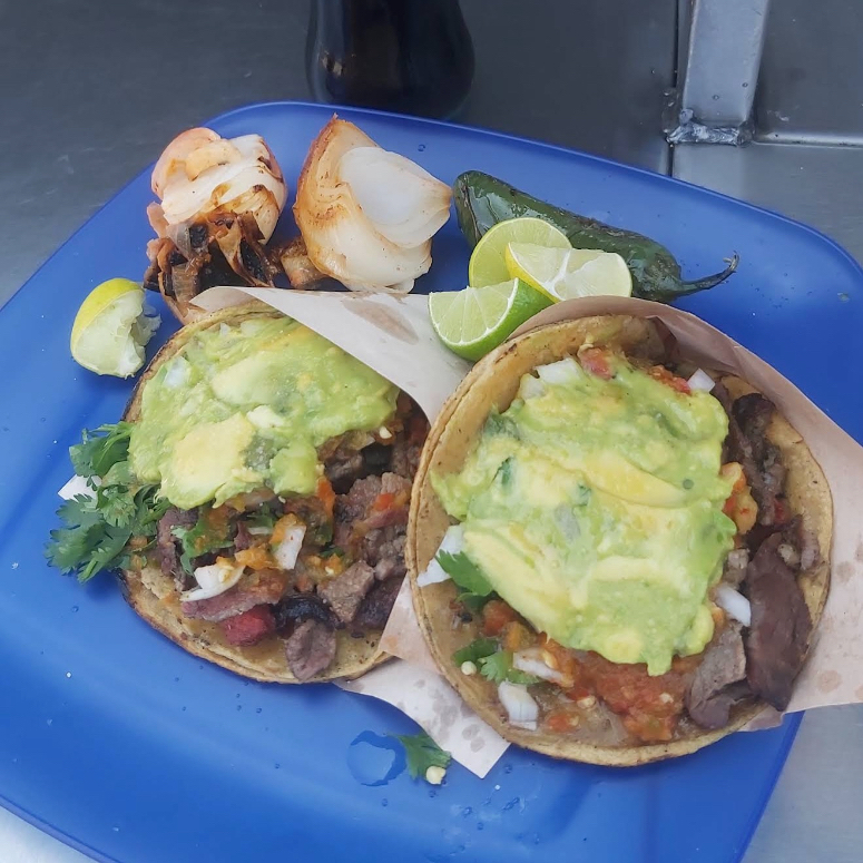 Taco con tortilla de maíz, asada, cilantro, cebolla, aguacate, frijoles y salsa, 1 pz.