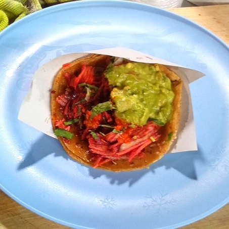 Taco con tortilla de maíz, Adobada, cilantro, cebolla, aguacate y salsa, 1 pz.
