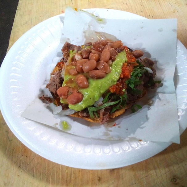 Tostada de asada, cilantro, cebolla, aguacate, frijoles y salsa, 1 pz.