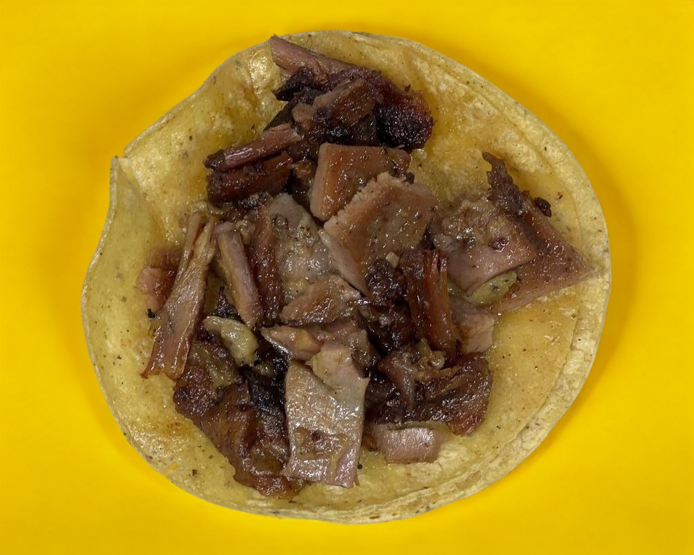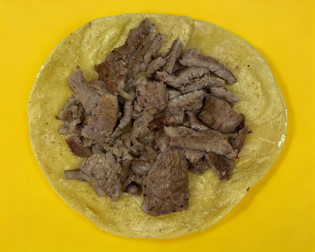 Tortilla con carne de res, cilantro, cebolla y salsa.