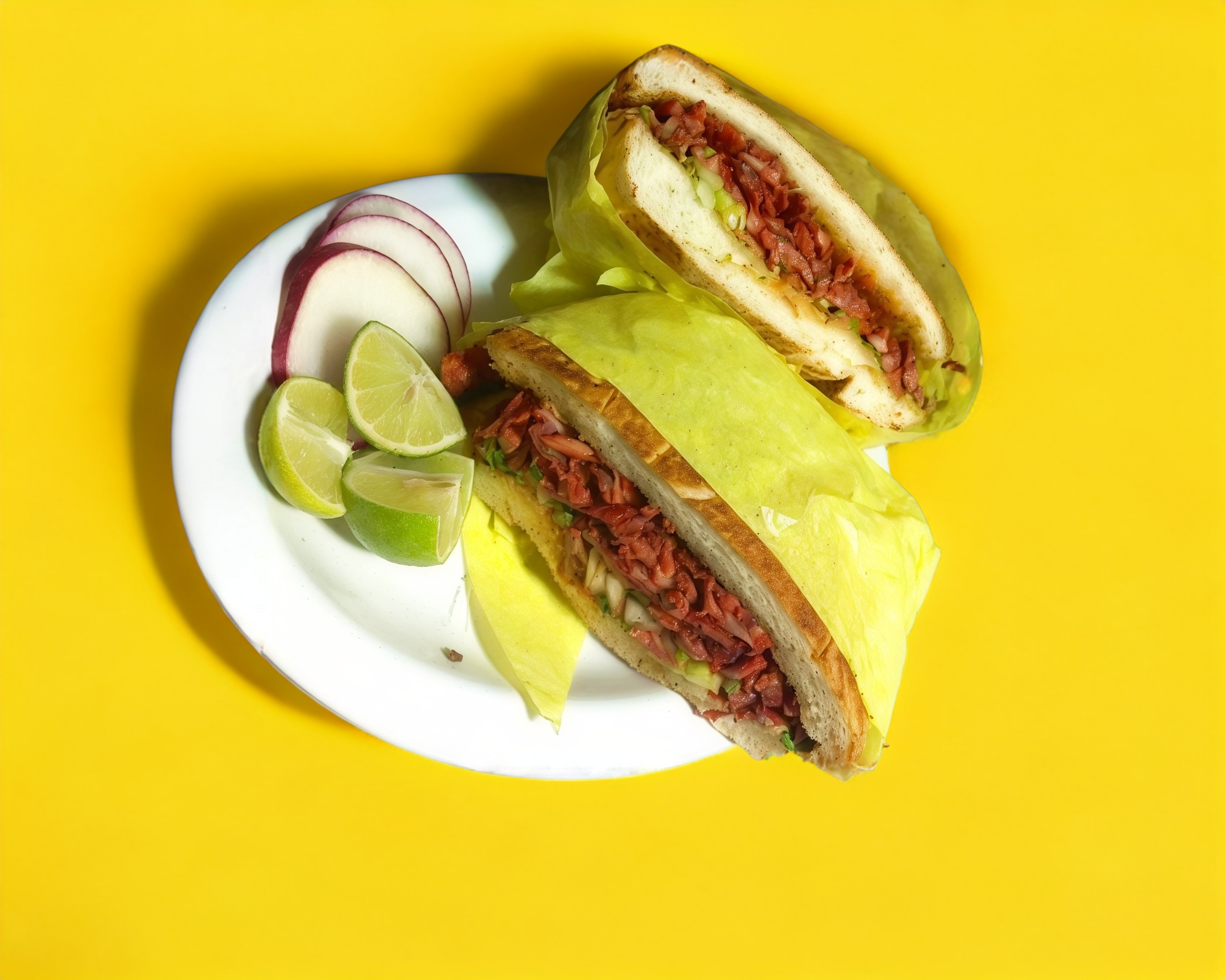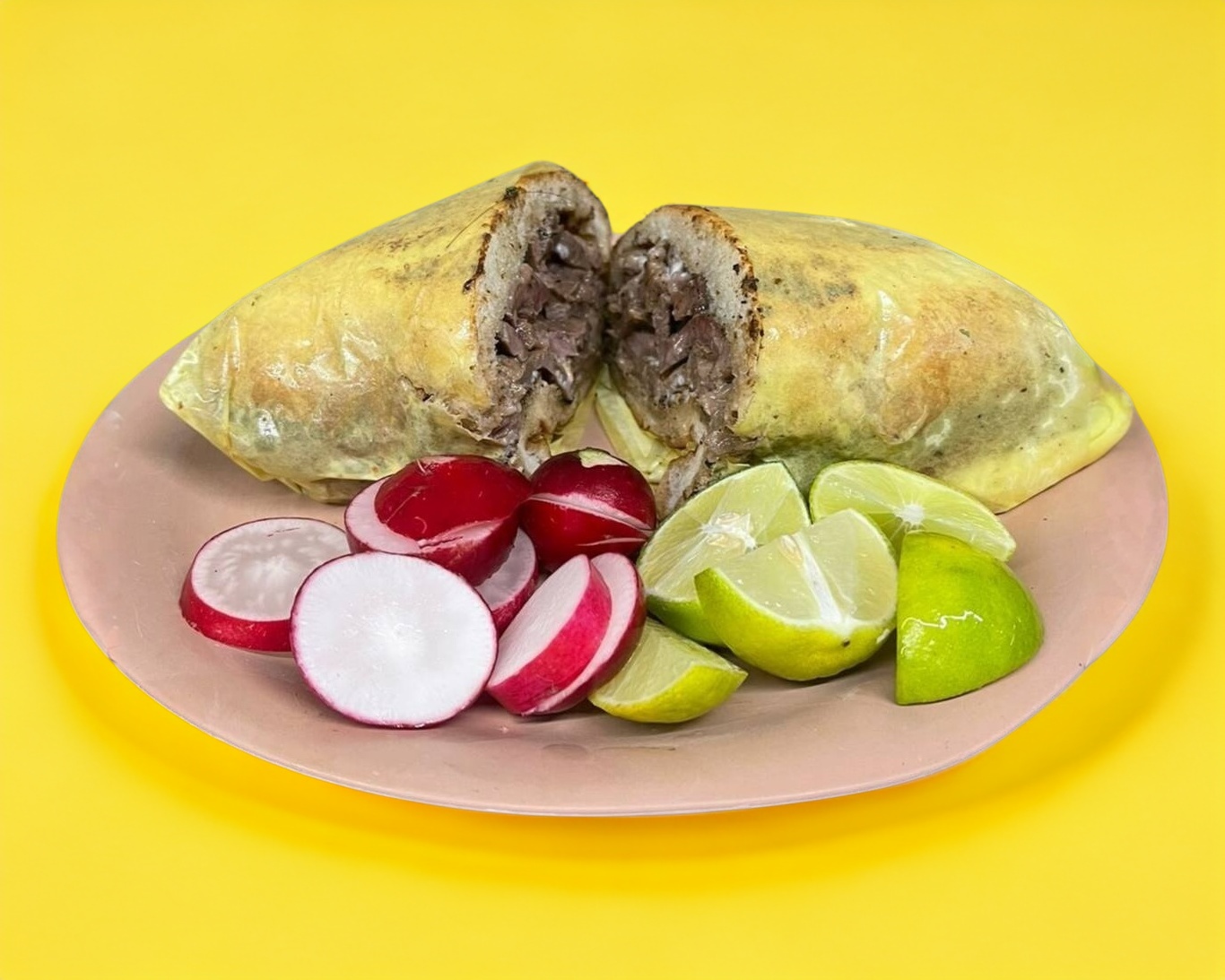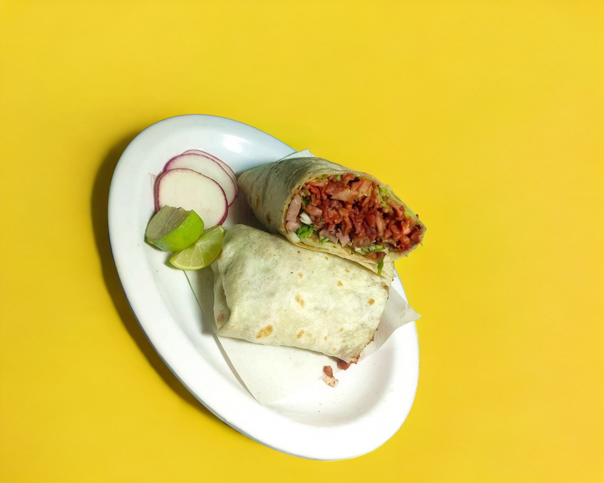 Burro de adobada o asada (a elección), acompañado de aguacate, verdura y salsa de la casa.