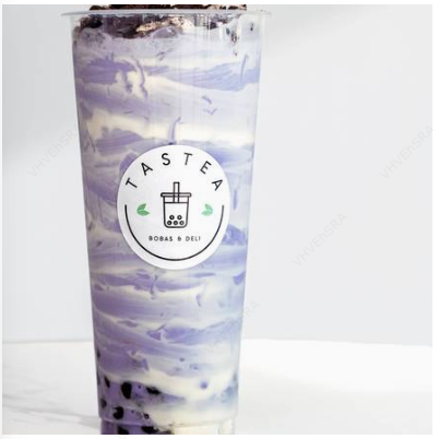 Taro con swirl de cheesecake y Oreo espolvoreado, bebidas de 22 oz o 650 ml, incluyen tapioca.