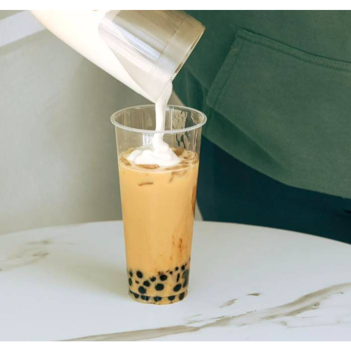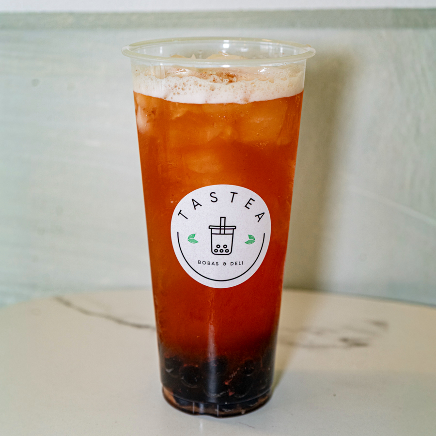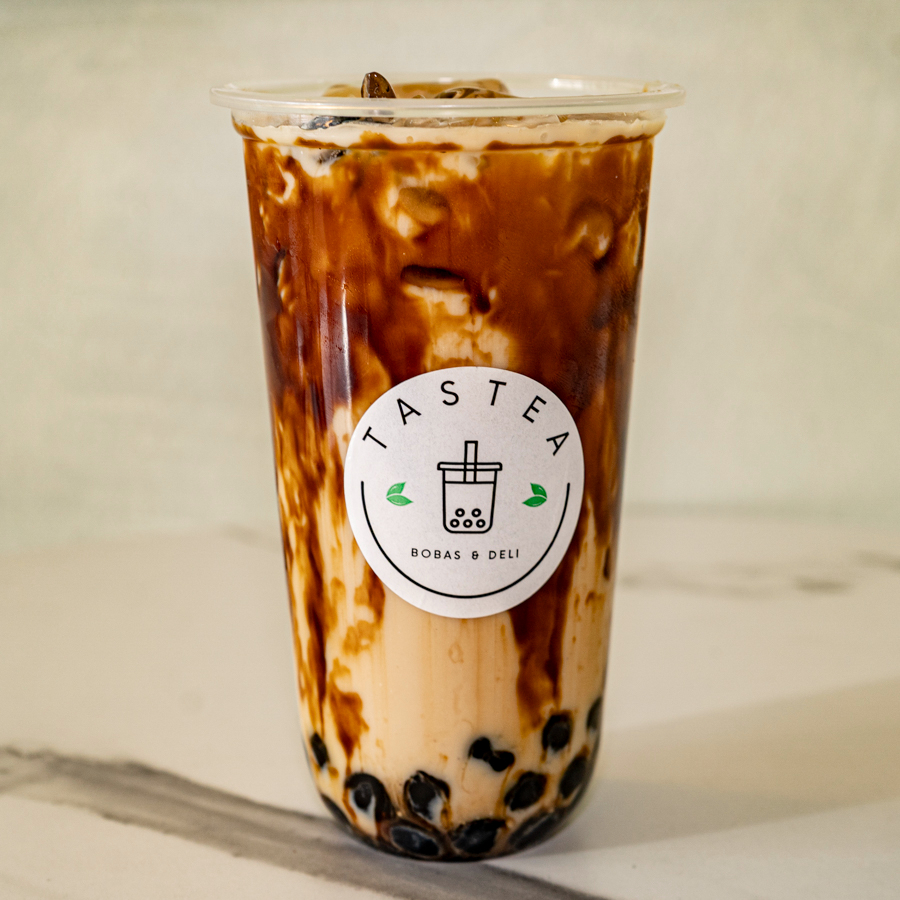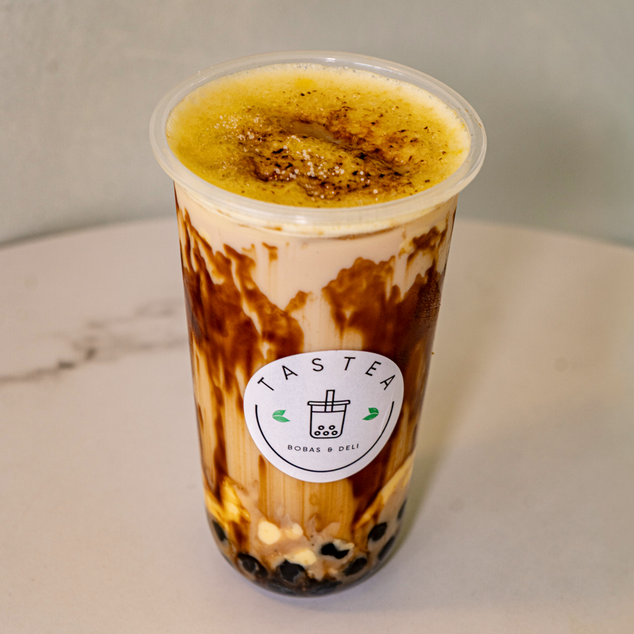 Milk tea clásico con una capa crujiente de caramelo,. bebidas de 22 oz o 650 ml, incluyen tapioca.