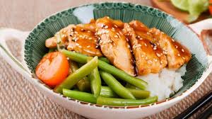 delisiosa cama de arroz con verduras a la plancha y pollo con salsa teriyaki y ajonjoli