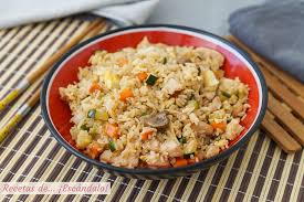 delisiosa cama de arroz con verduras a la plancha con pollo y salsa dulce