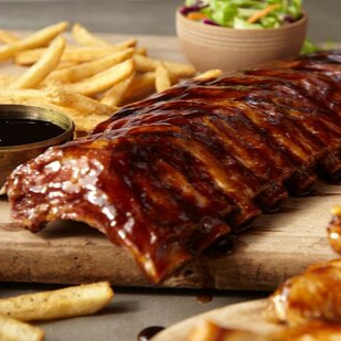 BABY BACK BBQ RIBS Tierno costillar de cerdo horneado y despues asado .Cubierto con nuestra salsa BBQ sabor manzana y especias; hecha en casa, acompañada con papas fritas y ensalada Coleslaw. *no incluye bebida. Foto Ilustrativa