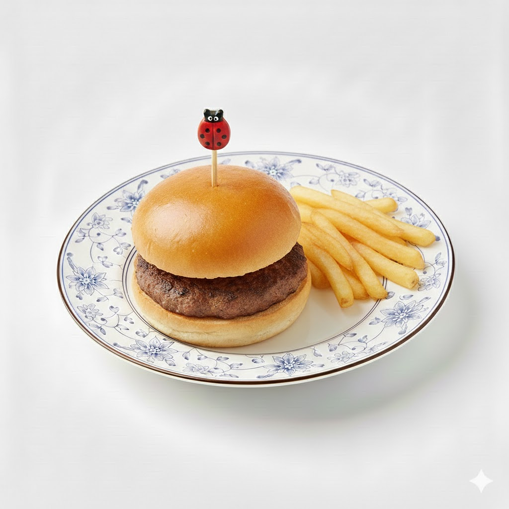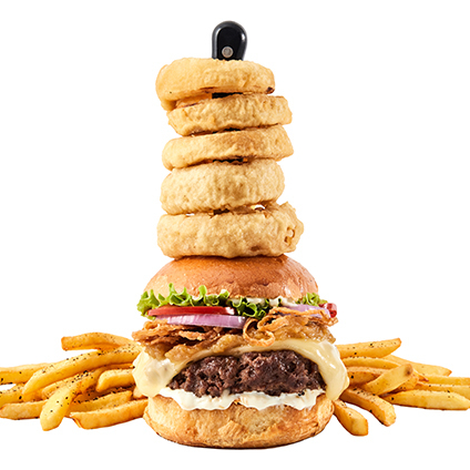 Dos Jugosas carnes asada a la parrilla al termino de tu elecccion, bañanada con nuestra exclusiva salsa signature,en un pan brioche, con queso Monterey jack, tocino, jitomate, lechuga, cebolla y papas fritas.