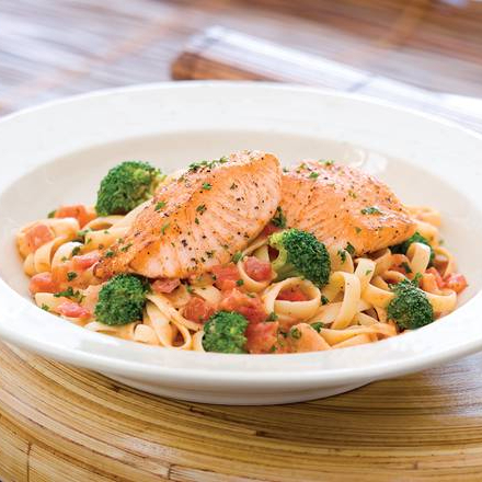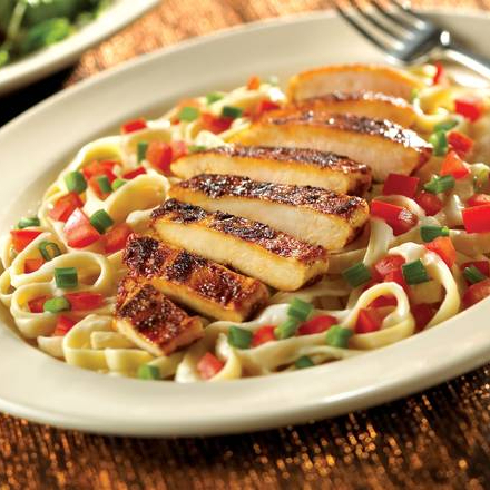 Pasta mediana con camarones cajún y pollo. Fettuccine de pasta en una salsa cremosa, con 4 camarones y 120 g de pechuga de pollo salteadas en nuestra mantequilla cajún, queso parmesano y pimientos rojos. Incluye 1 pieza de pan de ajo.