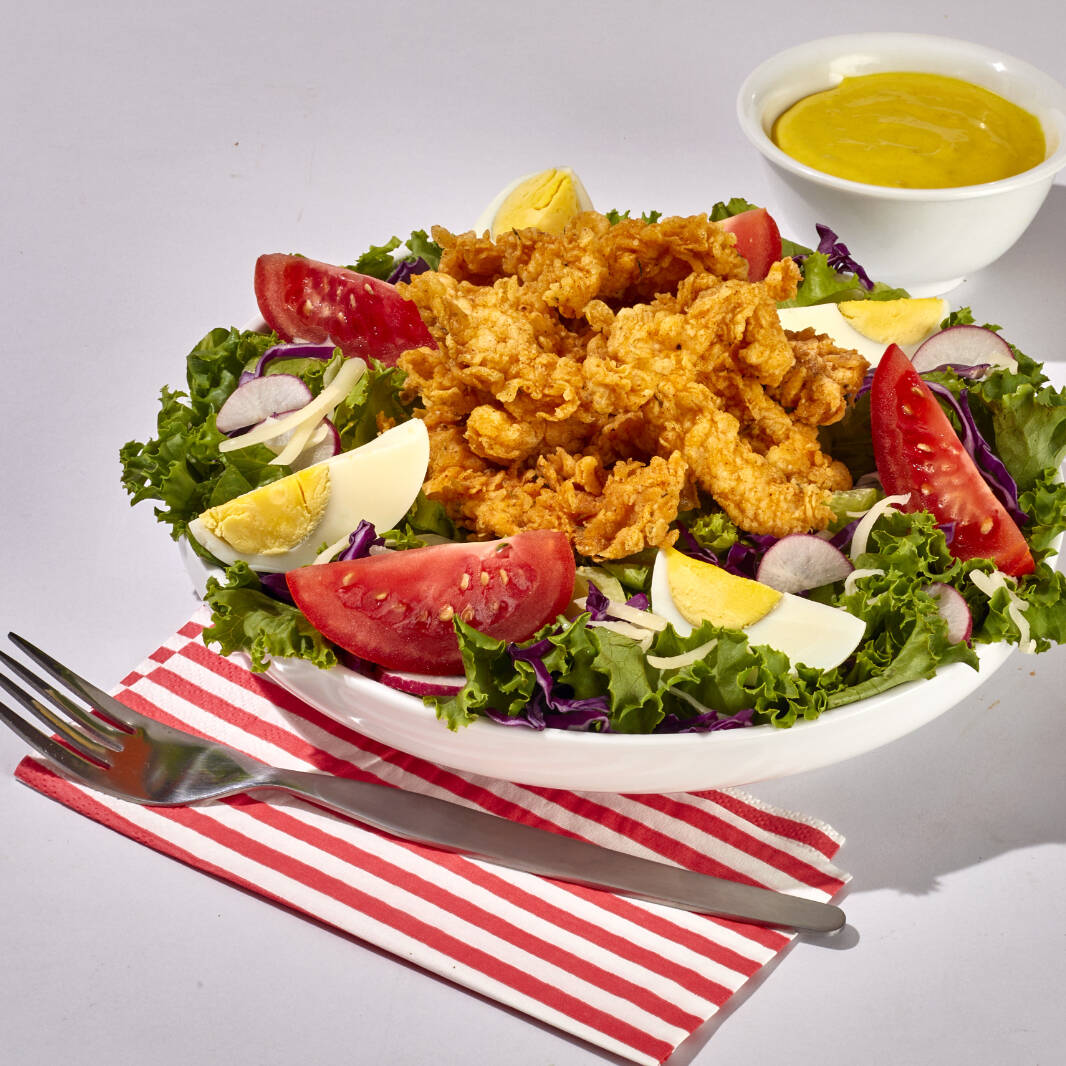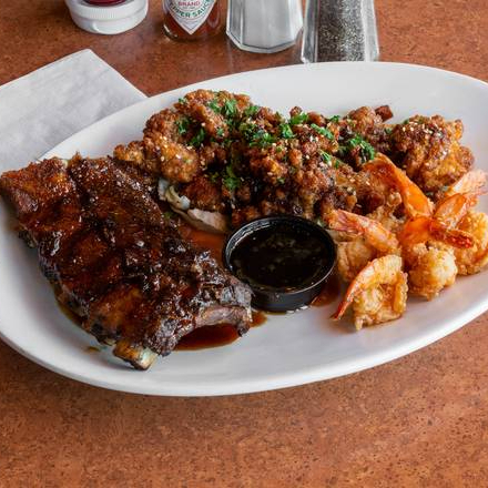 Camarones Crujientes, Tiras de pollo empanizadas en pan japones dorardito y tiernas costillitas de cerdo, todas generosamente cubiertas con nuestra exclusiva salsa Signature Glaze.