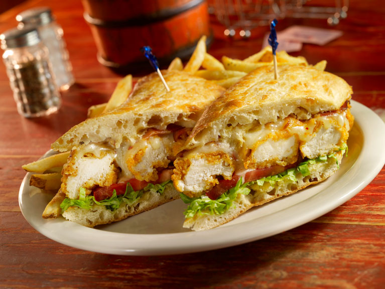 Crujientes tiras de pollo empanizado estilo Cajun, queso Monterey Jack derretido, servido en pan Ciabatta, mayonesa, tiras de tocino crujiente, lechuga y tomate. Incluye papas fritas Fridays.