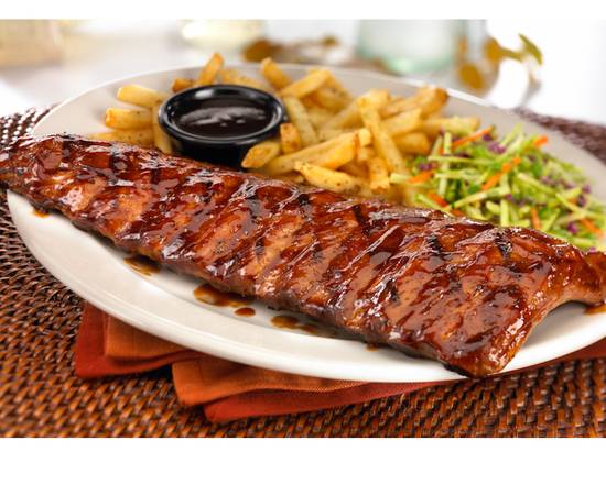 Tierno costillar de cerdo horneado y despues asado .Cubierto con nuestra salsa BBQ sabor manzana y especias; hecha en casa, acompañada con papas fritas y ensalada Coleslaw.