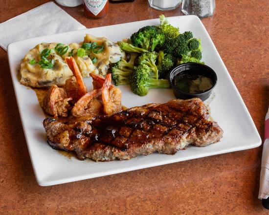 Corte de res asado a la parrilla y expertamente sazonado cocinado al termino de su eleccion, acompañado con 4 camarones fritos y sazonados estilo cajunñ pure de papas y vegetales del chef.