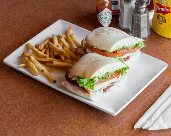 Generosa porcion de pehuga de pavo ahumada rebanada, jamón, tocino crujiente, queso Monterey Jack, tomate, lechuga rayada, guacamole en pan Ciabatta con Mayonesa. Incluye Papas Fritas Fridays.