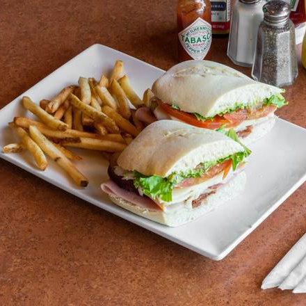 Sandwich en pan Ciabatta tostado con pechuga de pavo jitomate, lechuga, mayonesa, queso Monterey jack y papas fritas.