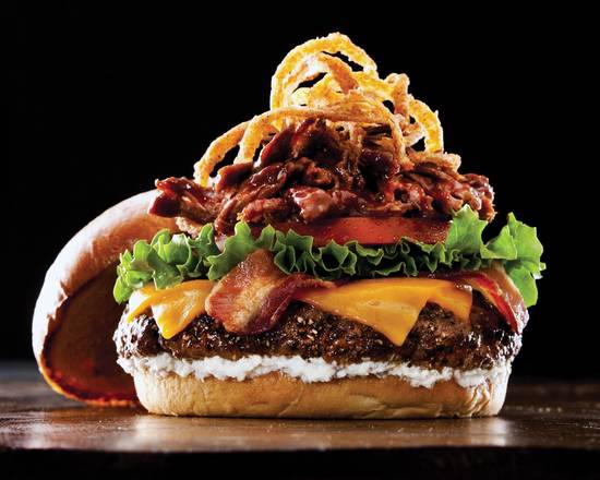 Hamburguesa de Carne 100% de res a la parrilla cocinada al término de su elección, carne deshebrada de cerdo deshebrada, tocino crujiente, queso cheddar, tomate, lechuga, cebolla y pepinillos. Una porción de papas fritas Fridays.