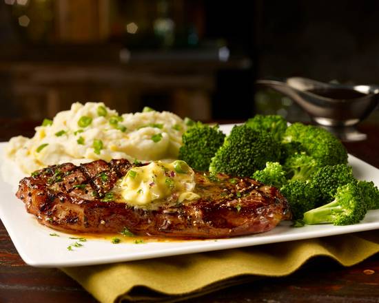 Clásico corte tierno de res 330grs, asado a la parrilla al término de su elección, escoja una mantequilla de sabor a su elección servido con pure de papas y vegetales al vapor.