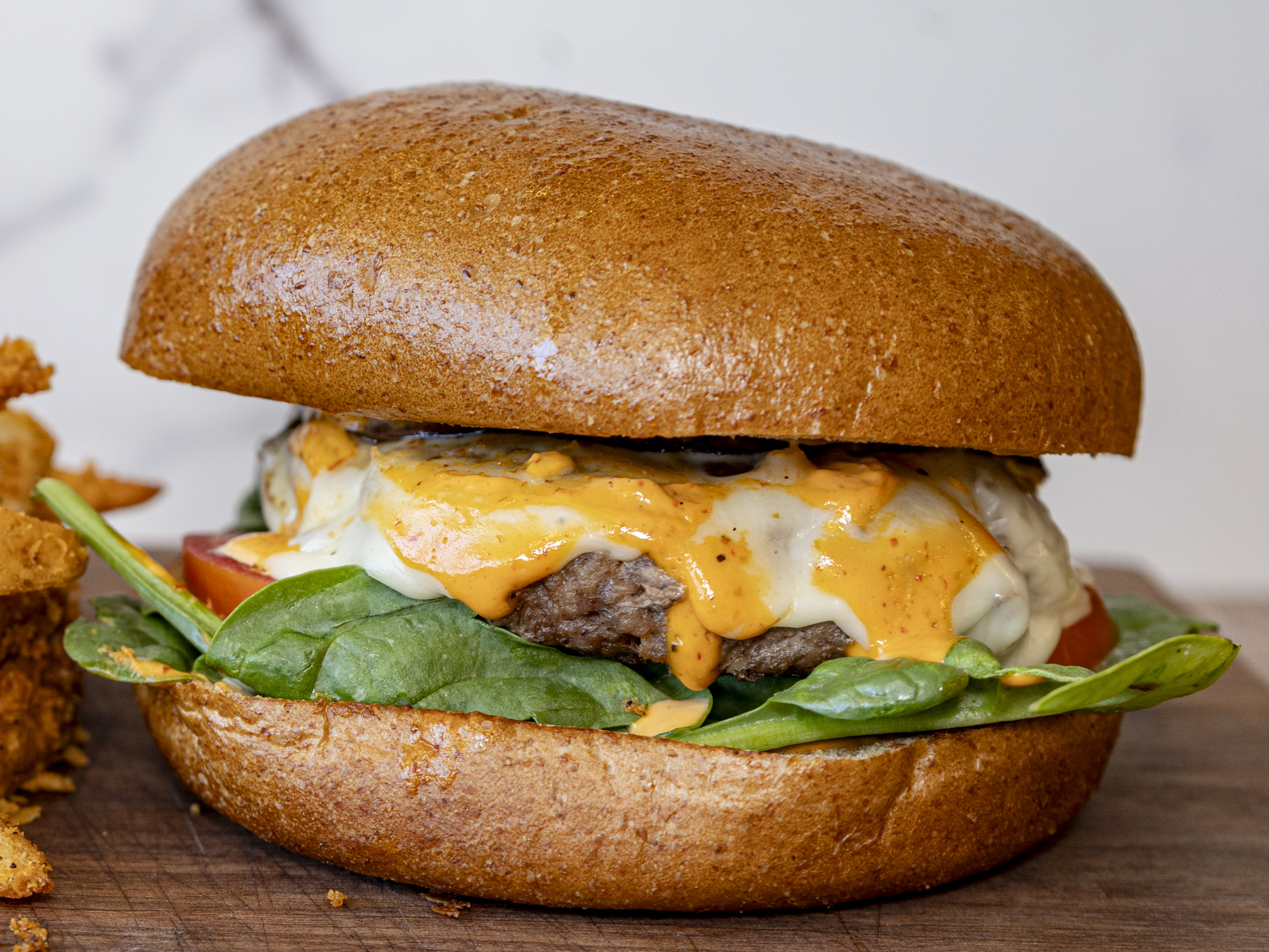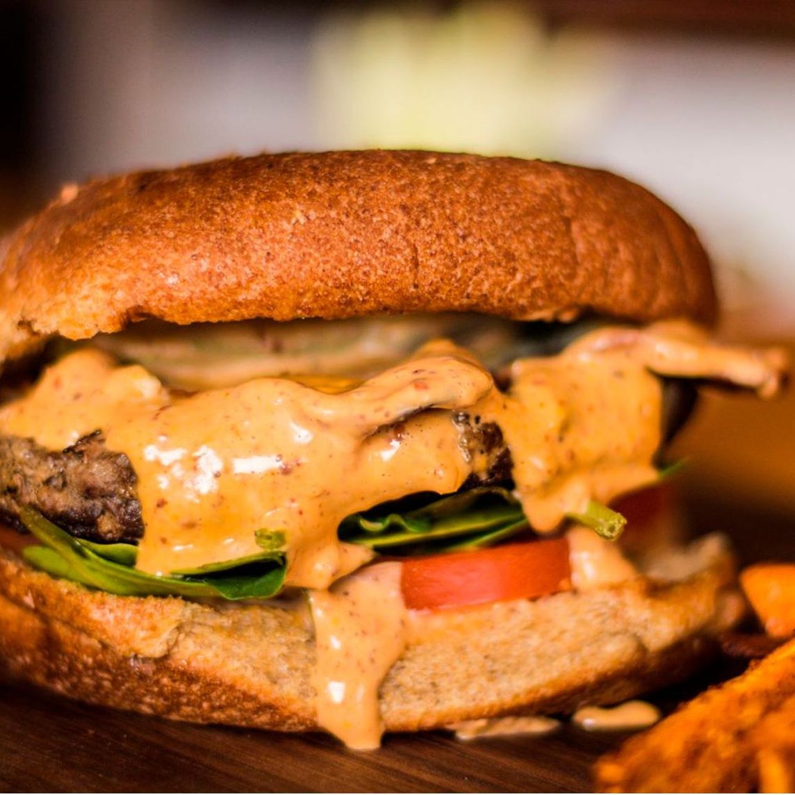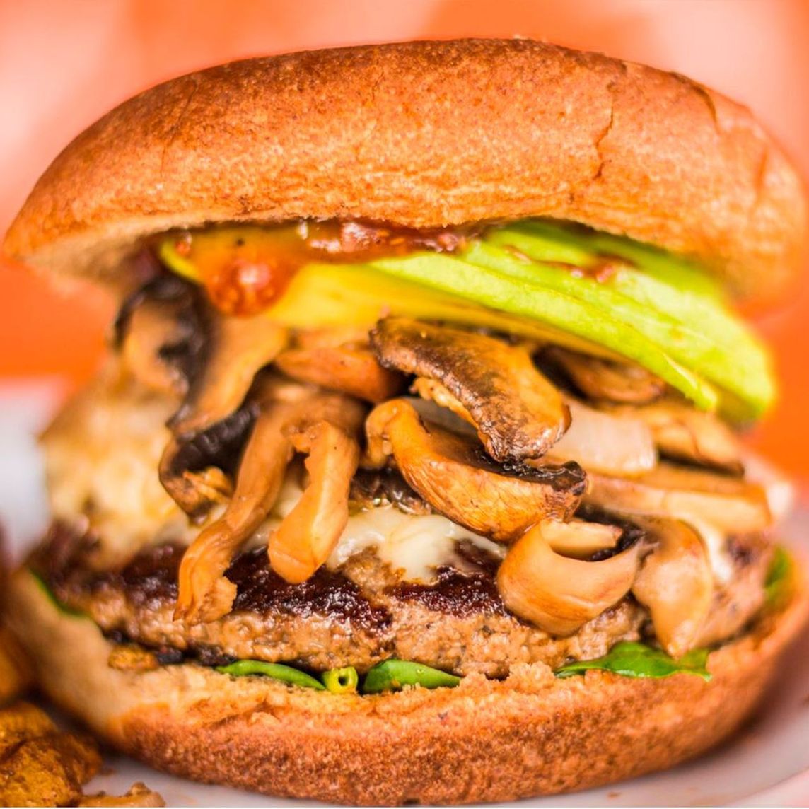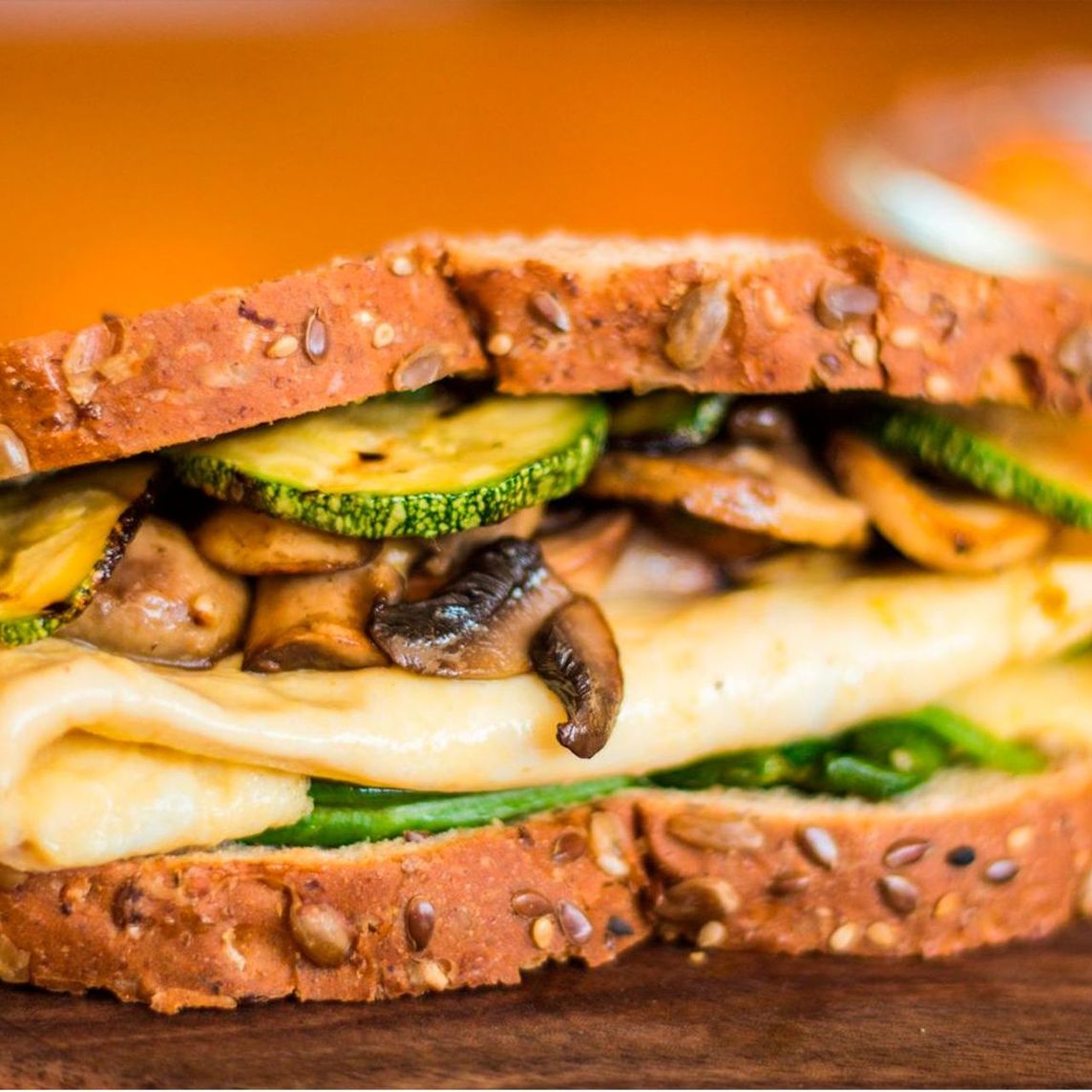 Queso suizo, champiñones salteados, espinacas. aguacate, cebolla caramelizada y pan integral más aderezo bbq dijón.
