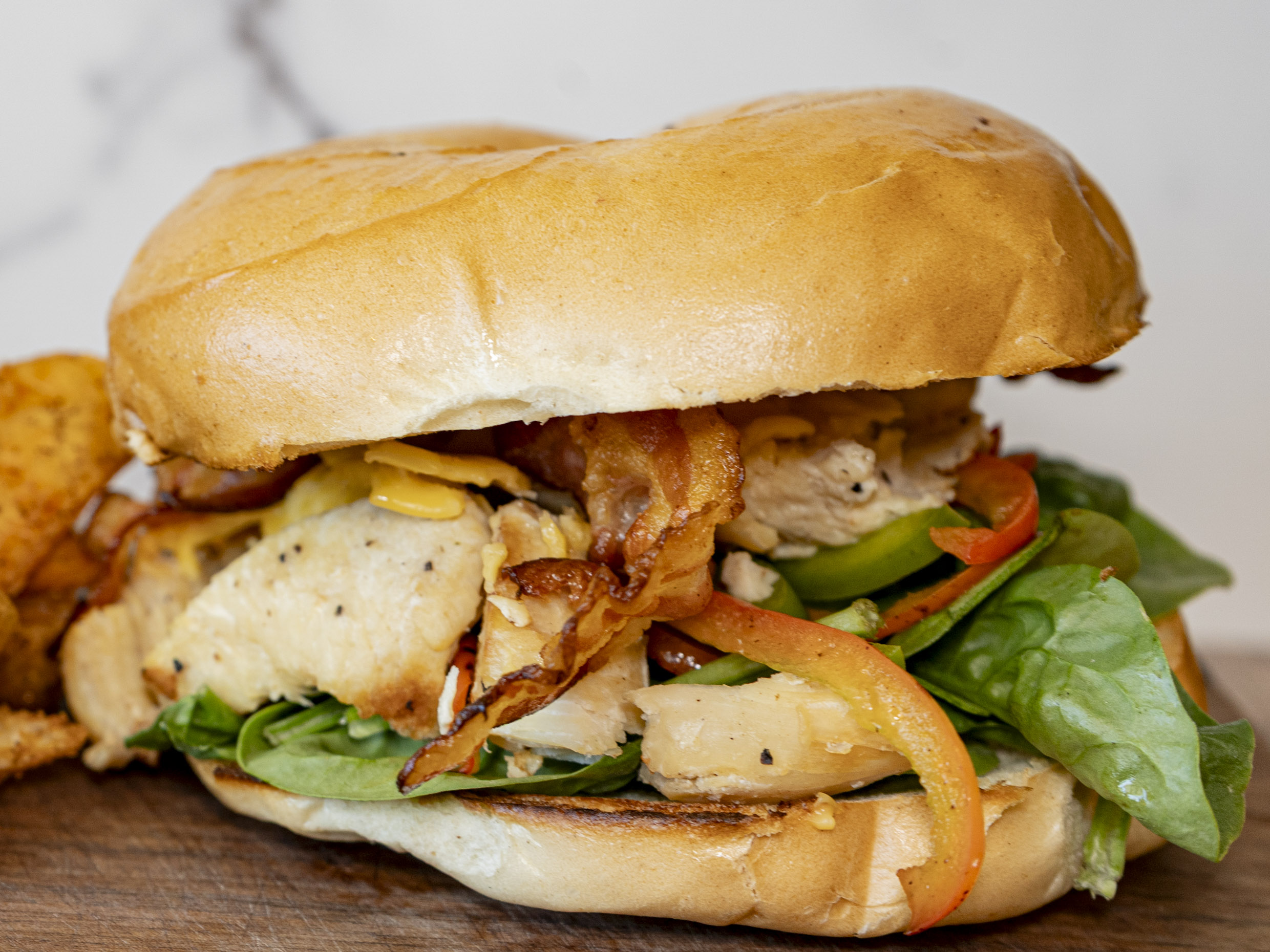 Tocino, aguacate, tomate, queso cheddar y pan integral más aioli chipotle.
