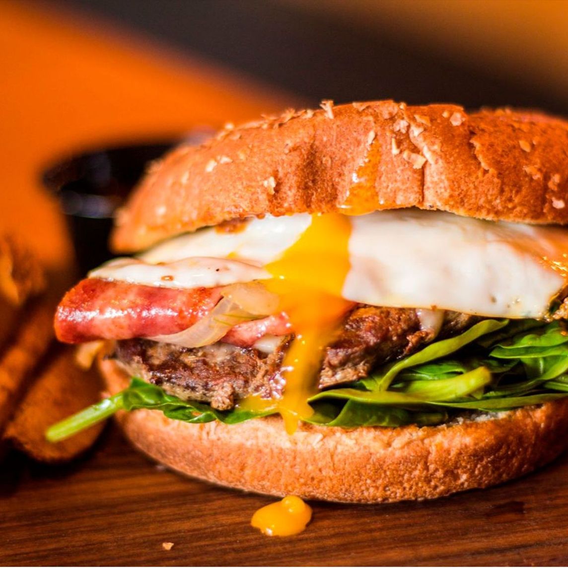 Tocino, huevo, queso suizo, cebolla caramelizada, espinacas y pan integral más aderezo bbq dijón.
