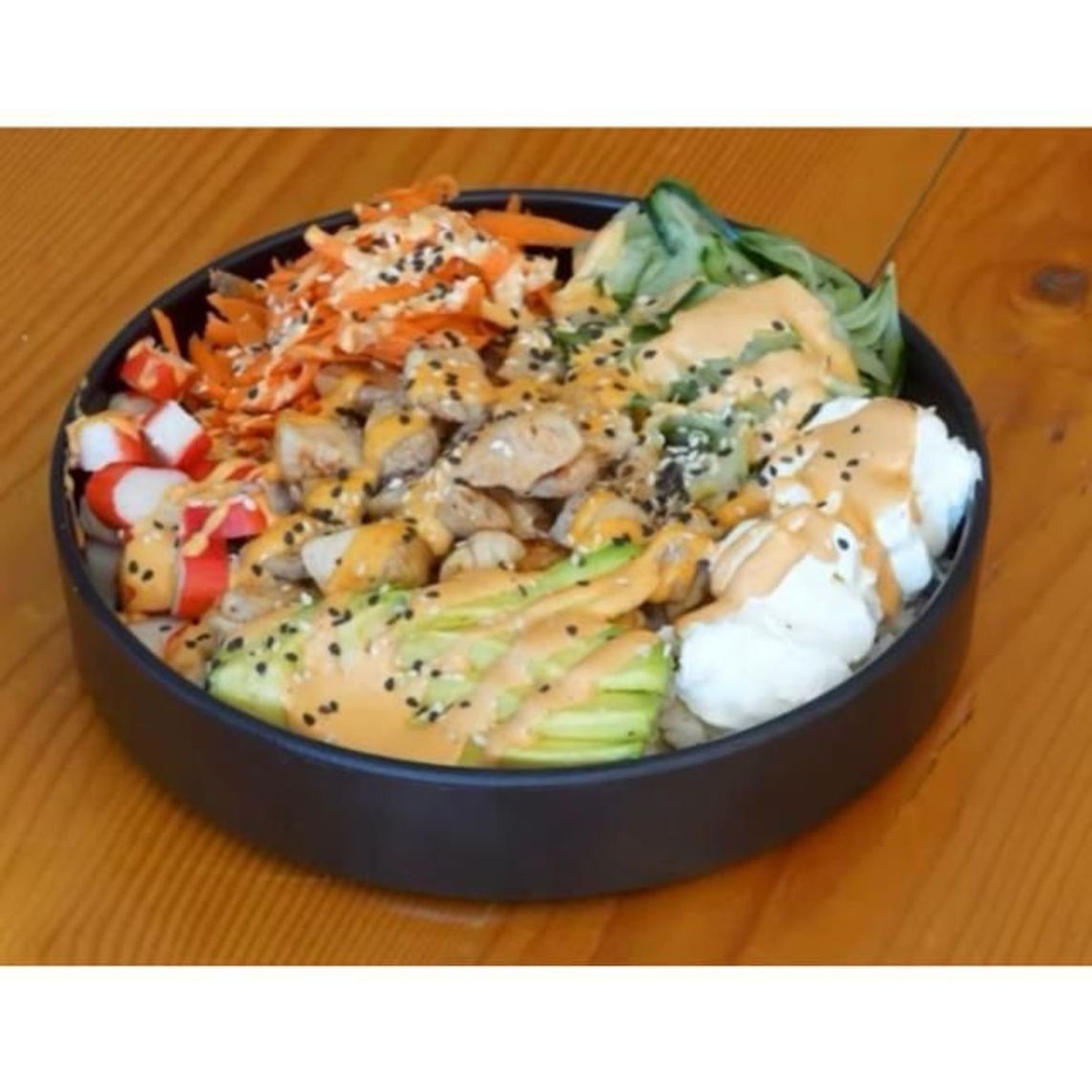 Aguacate, pepino cristalizado, zanahoria, queso crema, surimi, ajonjilí más aioli sriracha y soya.