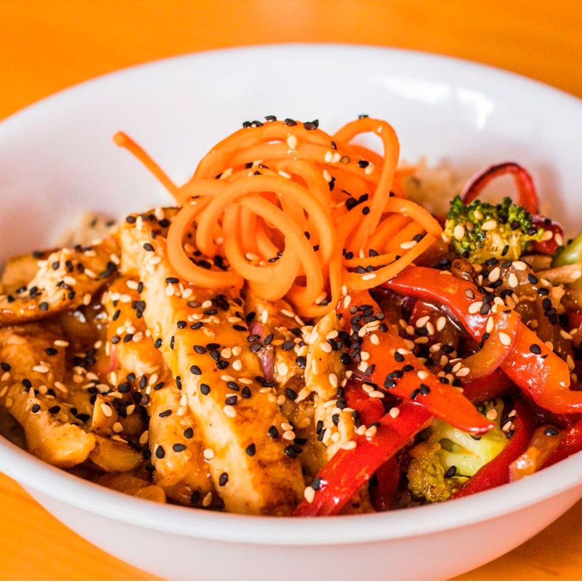 Arroz integral, 50gr pollo, verduras y salsa teriyaki.