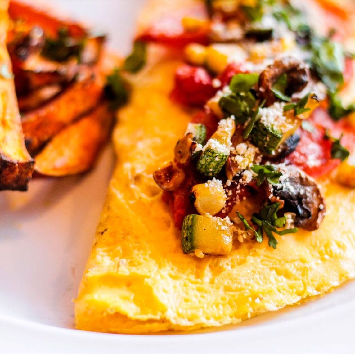 Huevo, calabacita, elote tierno tatemado, champiñones y tomates rostizados, todo salteado en aceite de oliva añadido, queso parmesano.