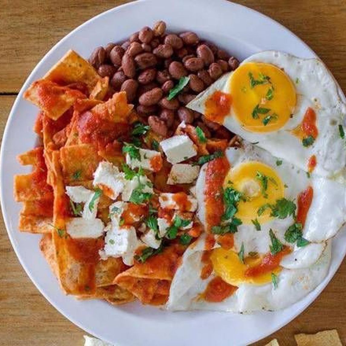 Totopo hecho en casa, huevo, frijol negro y queso panela, salsa de la casa.