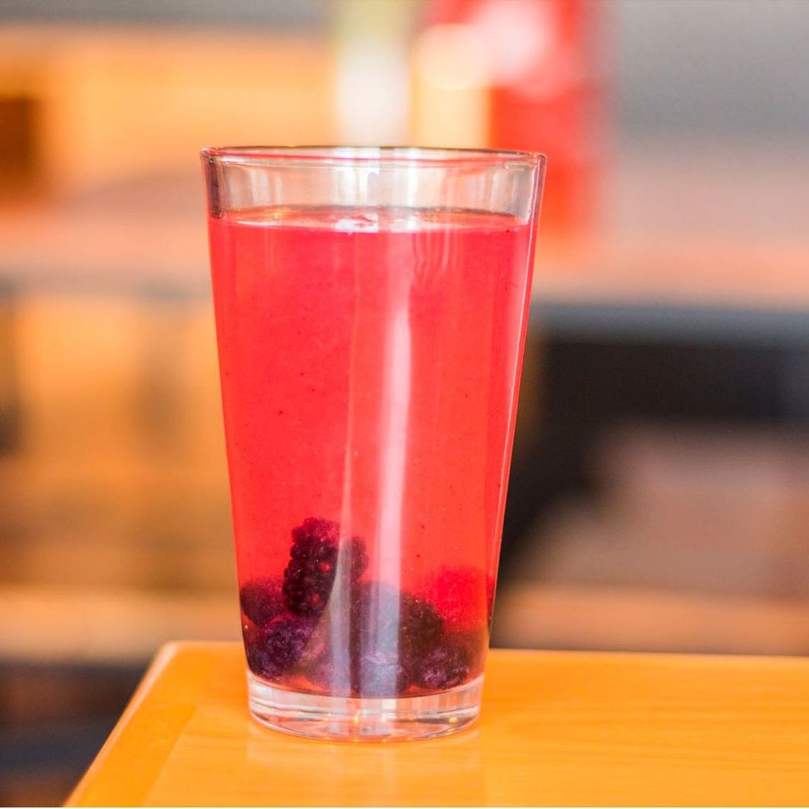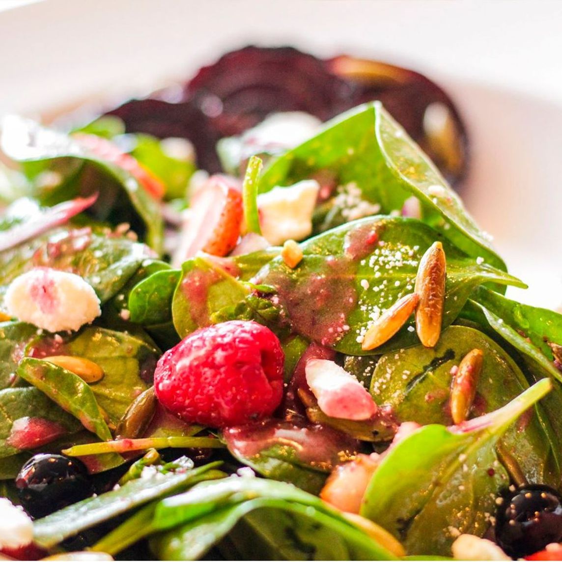 Espinacas, blueberries, betabel rostizado, fresas, frambuesa (en temporada), pepitas, queso feta y vinagreta de frutos rojos