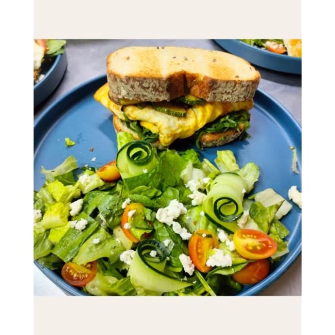 Huevo mezclado con pesto de cilantro, queso mozarella, queso parmesano y tomates rostizados. Acompañado de ensalada